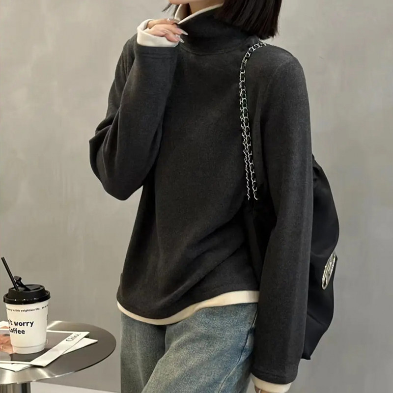 双面德绒打底衫女秋冬2025春新款洋气上衣拼色假两件高领保暖小衫