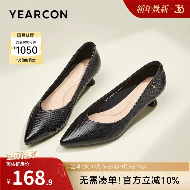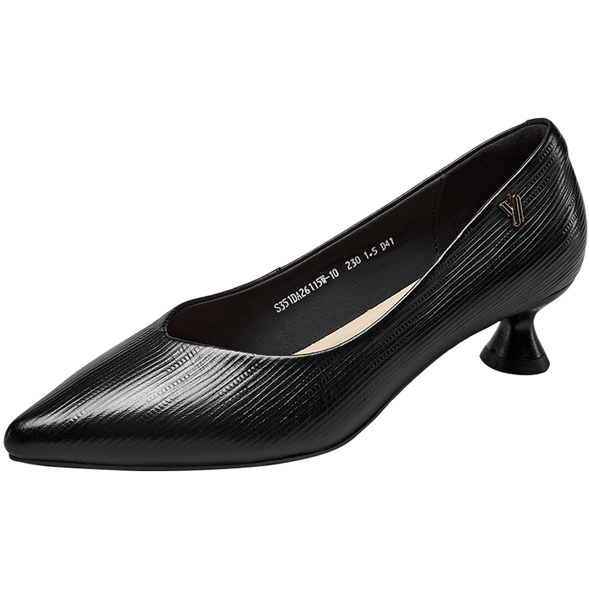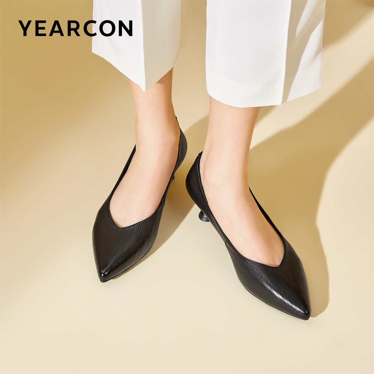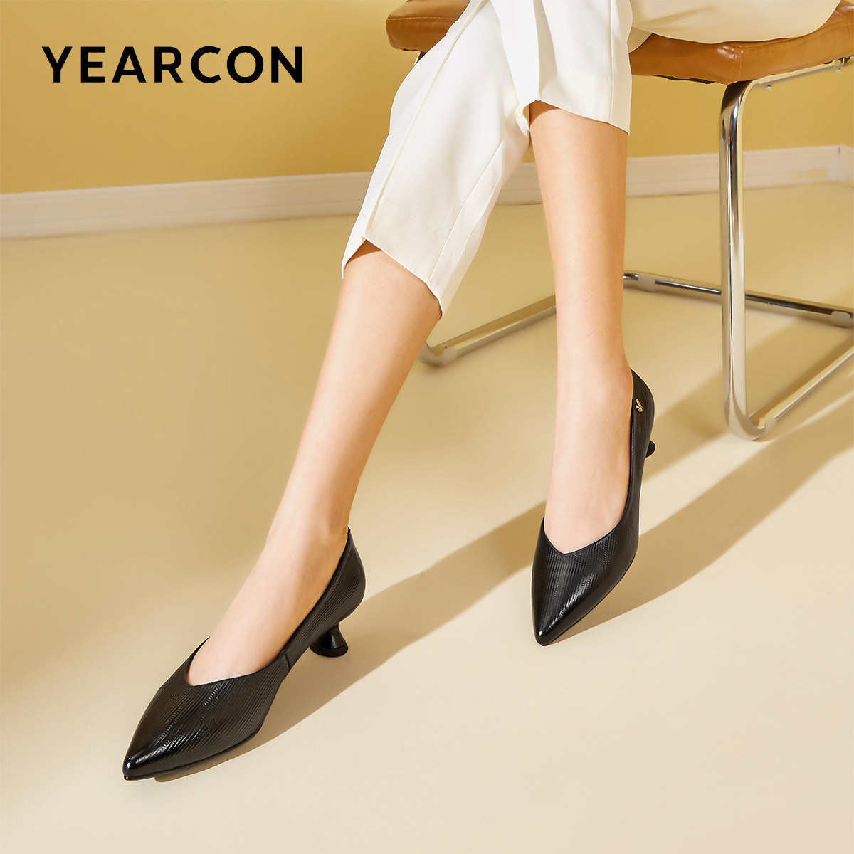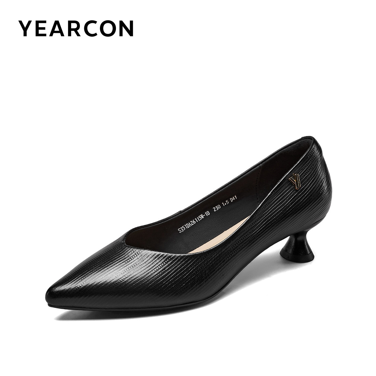 意尔康女鞋春秋季女士真皮尖头中跟浅口单鞋法式气质通勤工作鞋