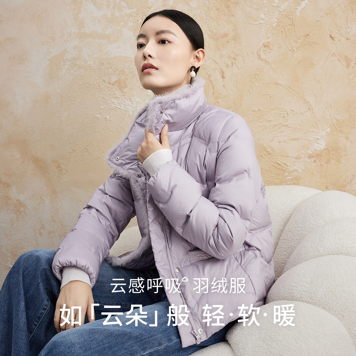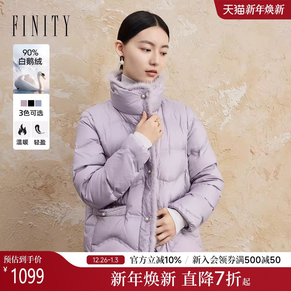 FINITY菲妮迪短外套25冬水貂毛领紫色保暖90白鹅绒羽绒服外套女装