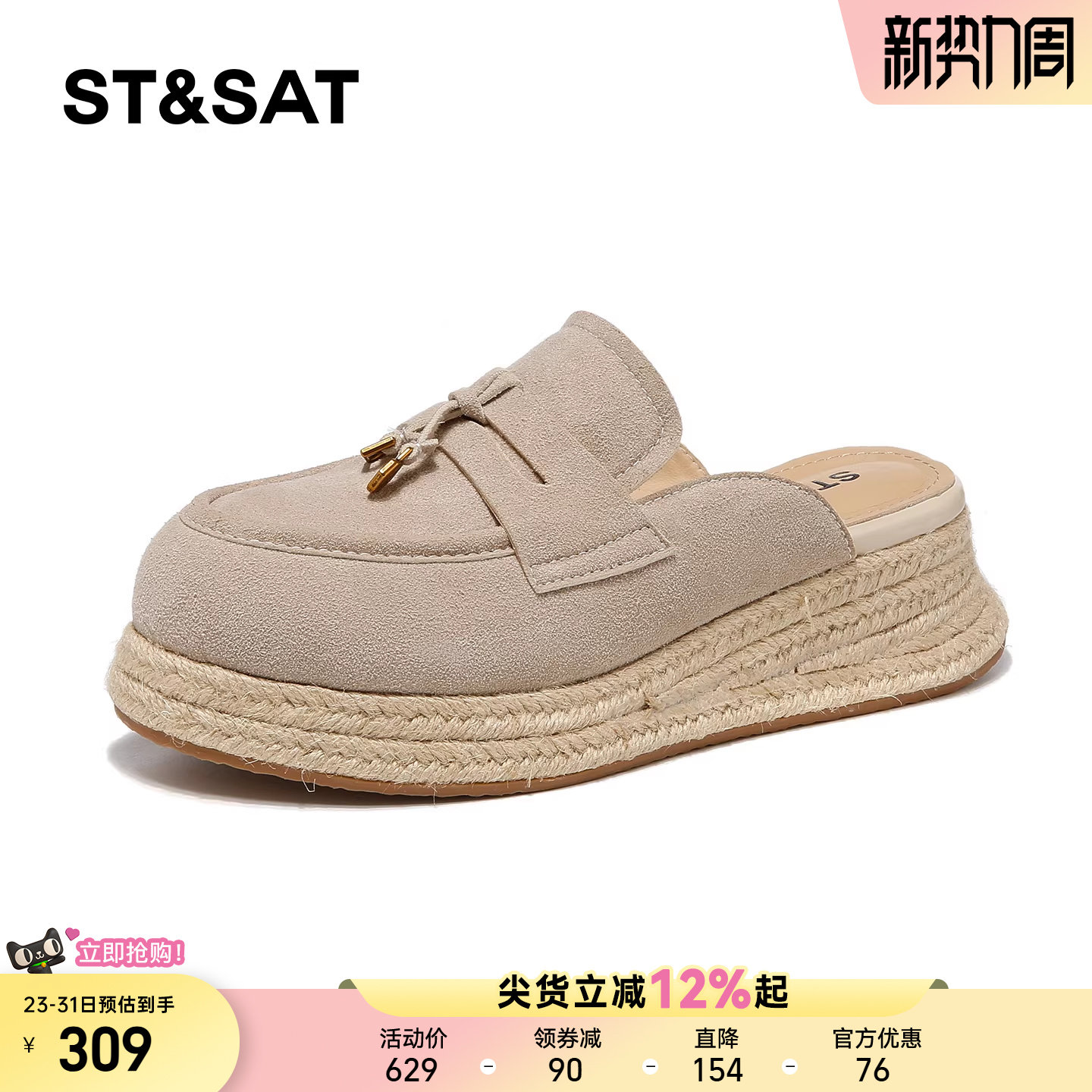 星期六草编包头半拖鞋女新款春外穿厚底懒人一脚蹬休闲复古渔夫鞋