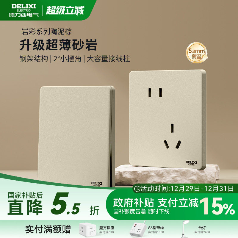 德力西岩彩超薄开关插座奶油风磨砂面板一开五孔16a暗装USB陶泥棕