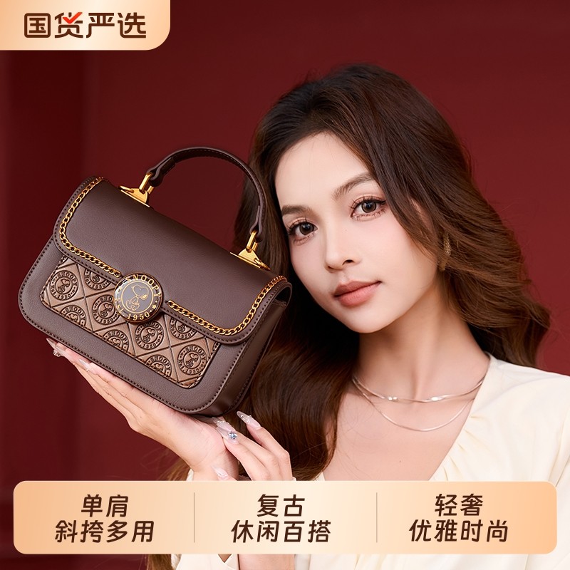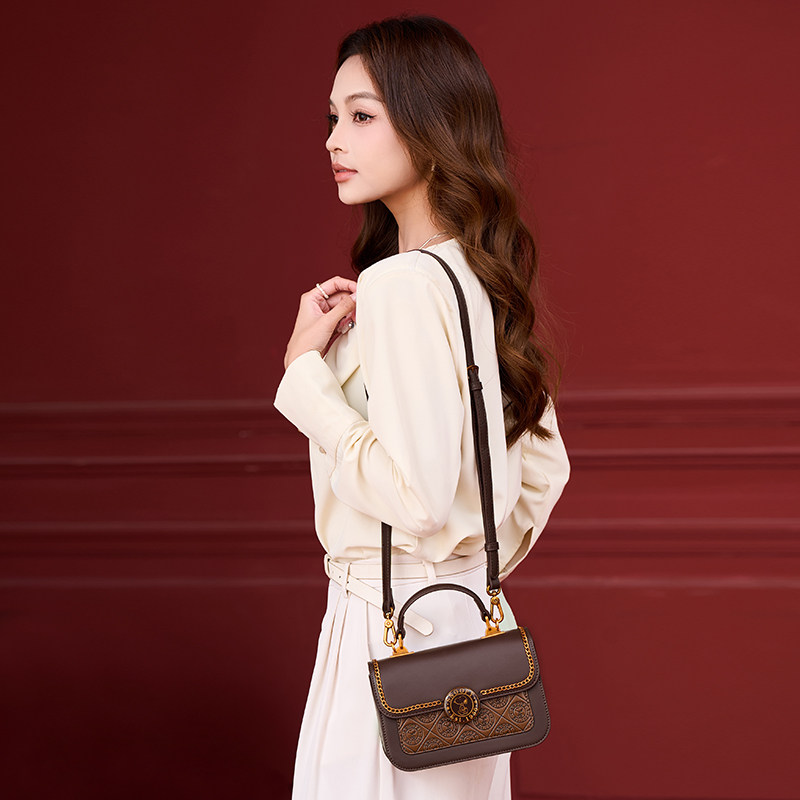 品牌女包轻奢复古老花单肩斜挎小包包2025新款高级感真皮小方包