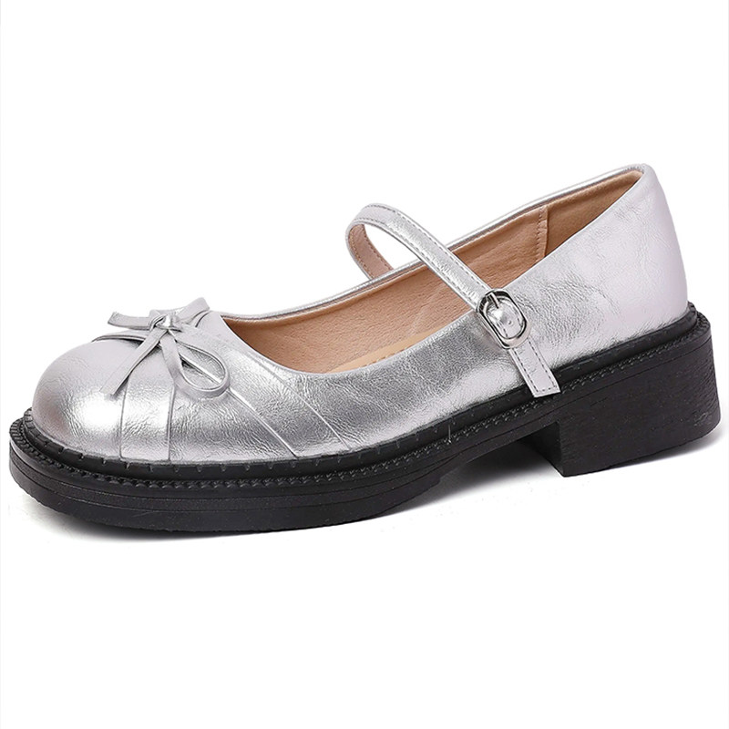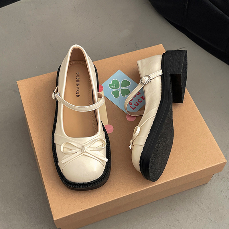 真皮~骄屿法式仙女风高跟鞋女婚鞋玛丽珍鞋珍珠系蝴蝶结粗跟单鞋