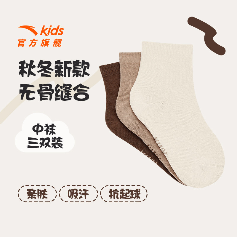 安踏儿童袜子男童袜子女童袜子跑步运动袜子秋冬三双装中袜保暖袜