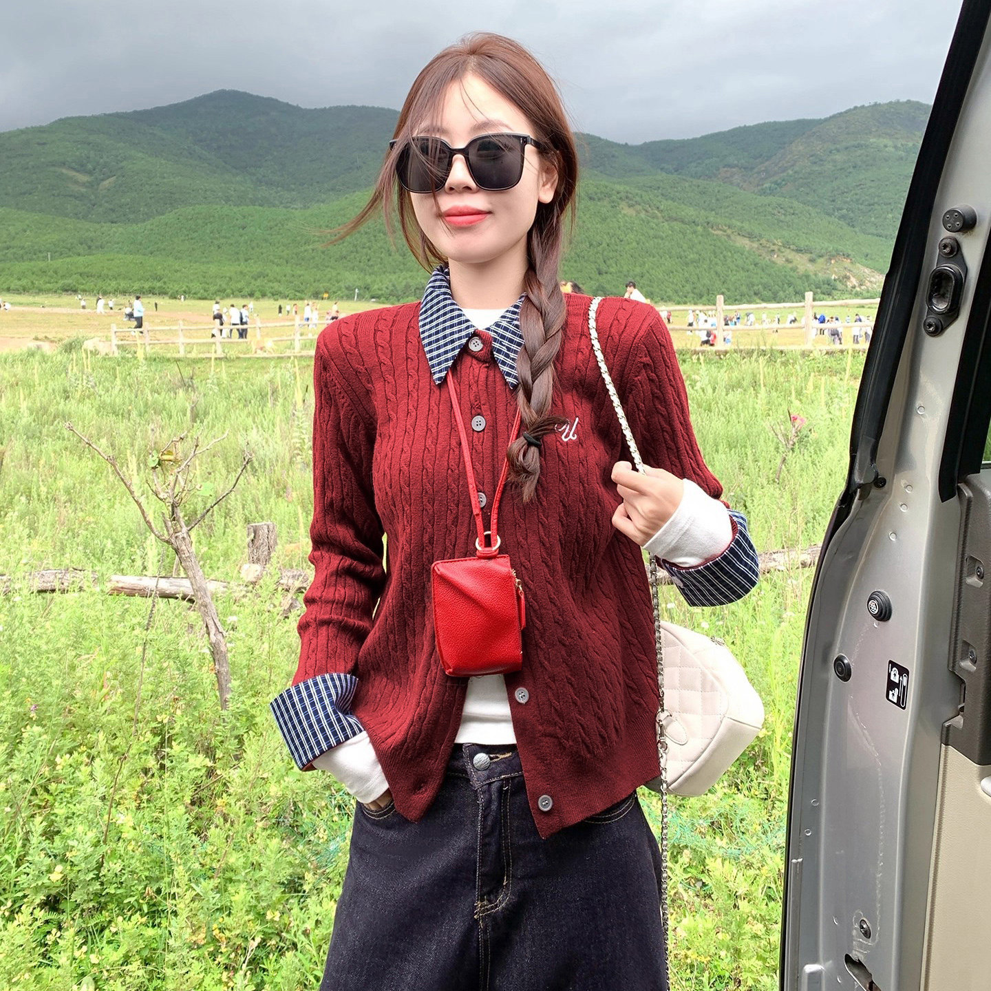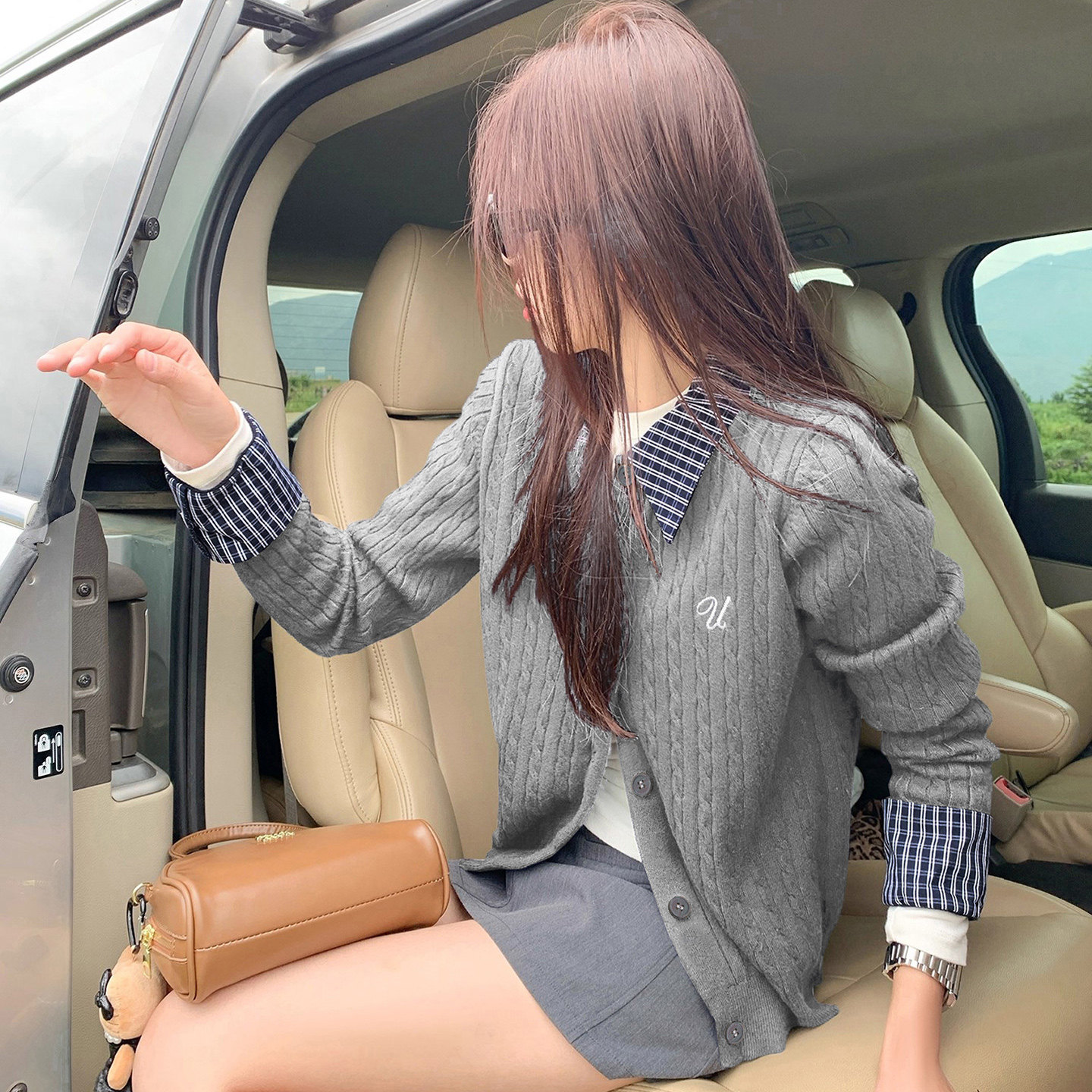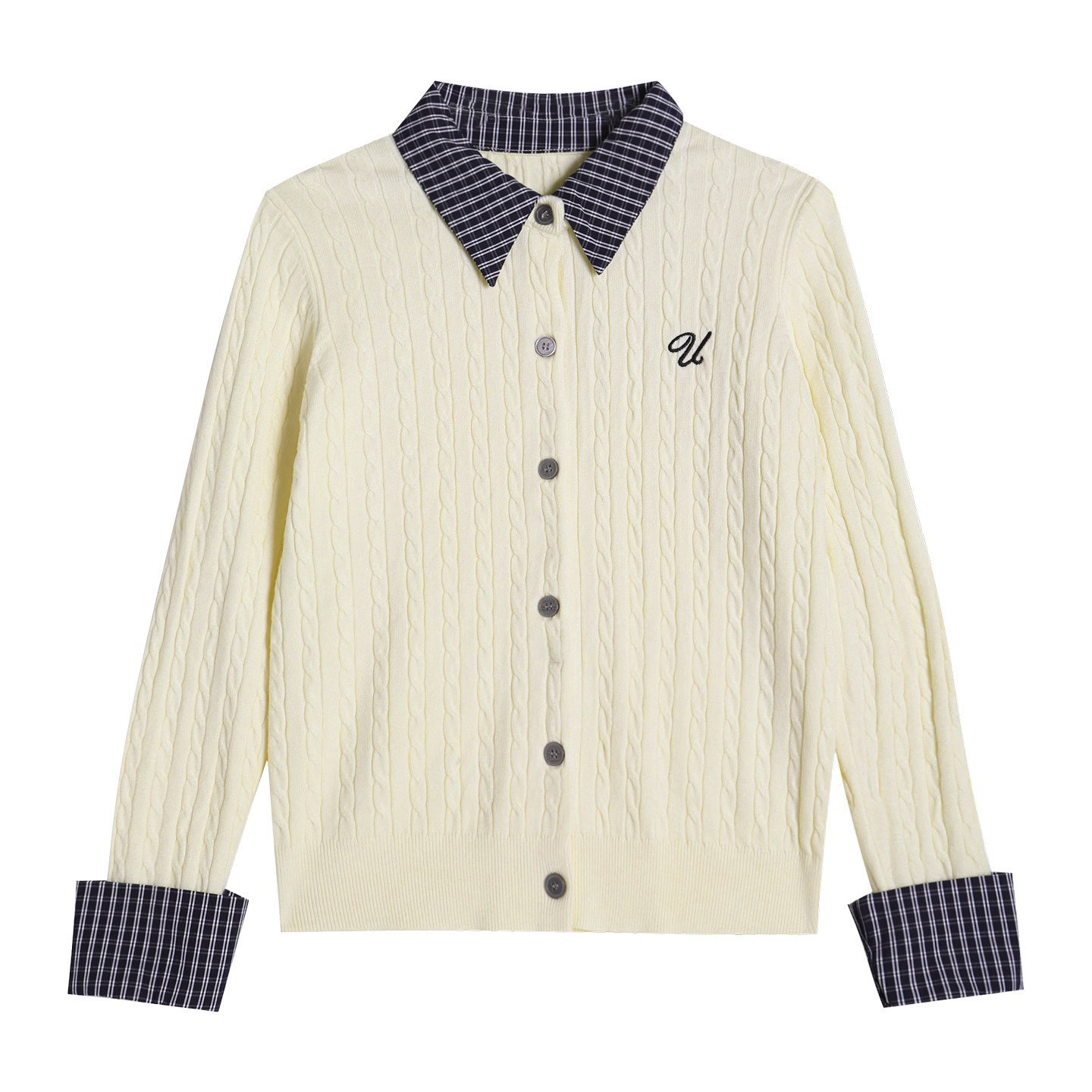 KP真维斯韩系polo领针织开衫女秋季麻花假两件格子长袖毛衫外套女