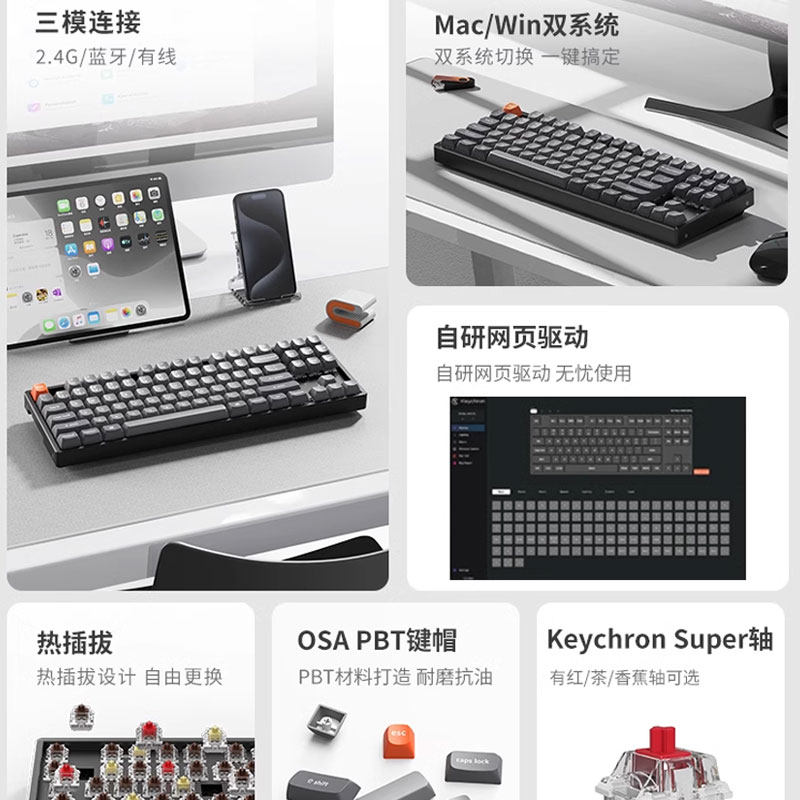 Keychron K8MAX蓝牙无线机械键盘87键三模办公客制化win静音轴mac
