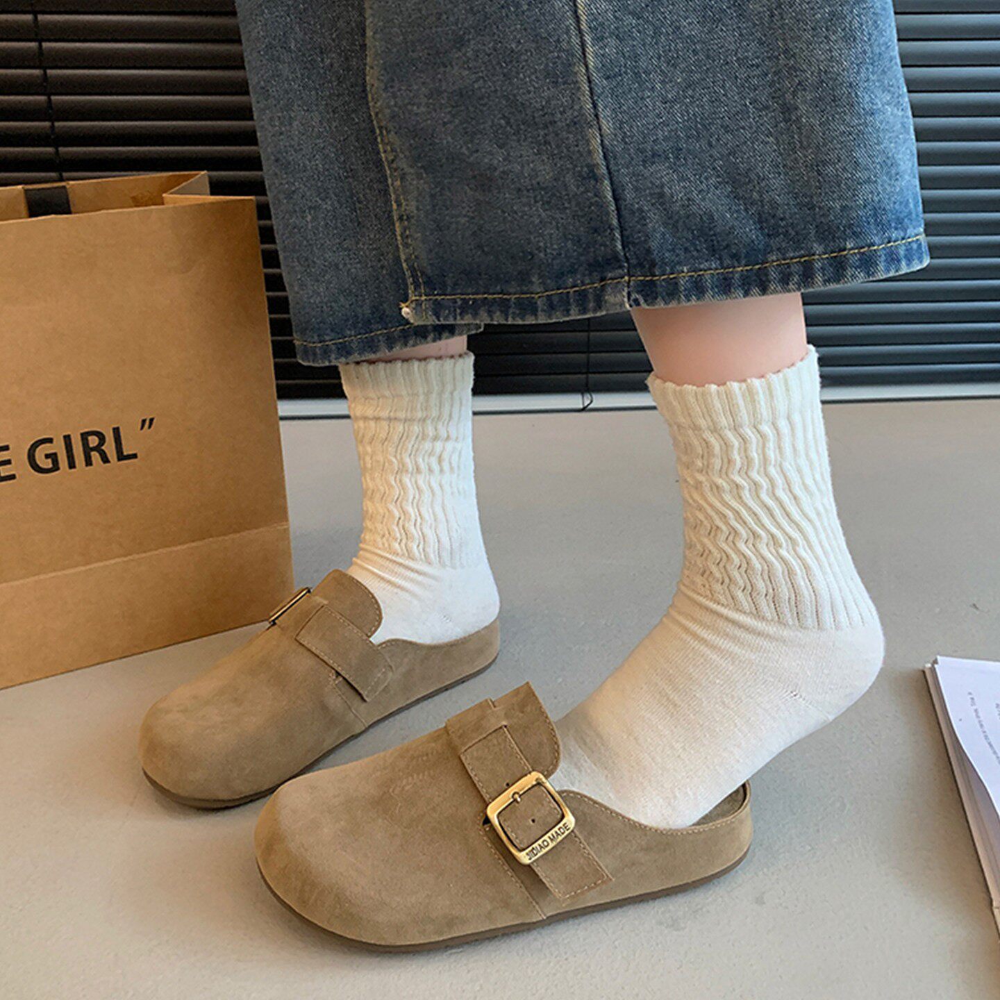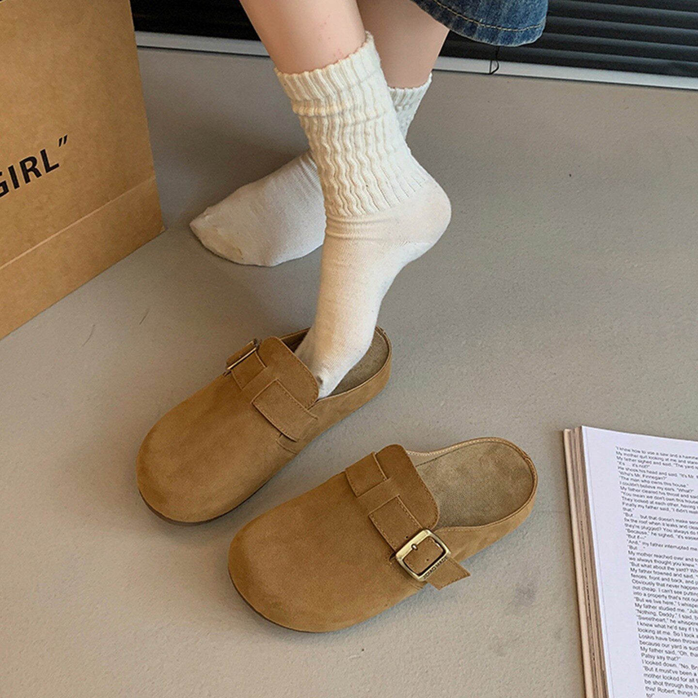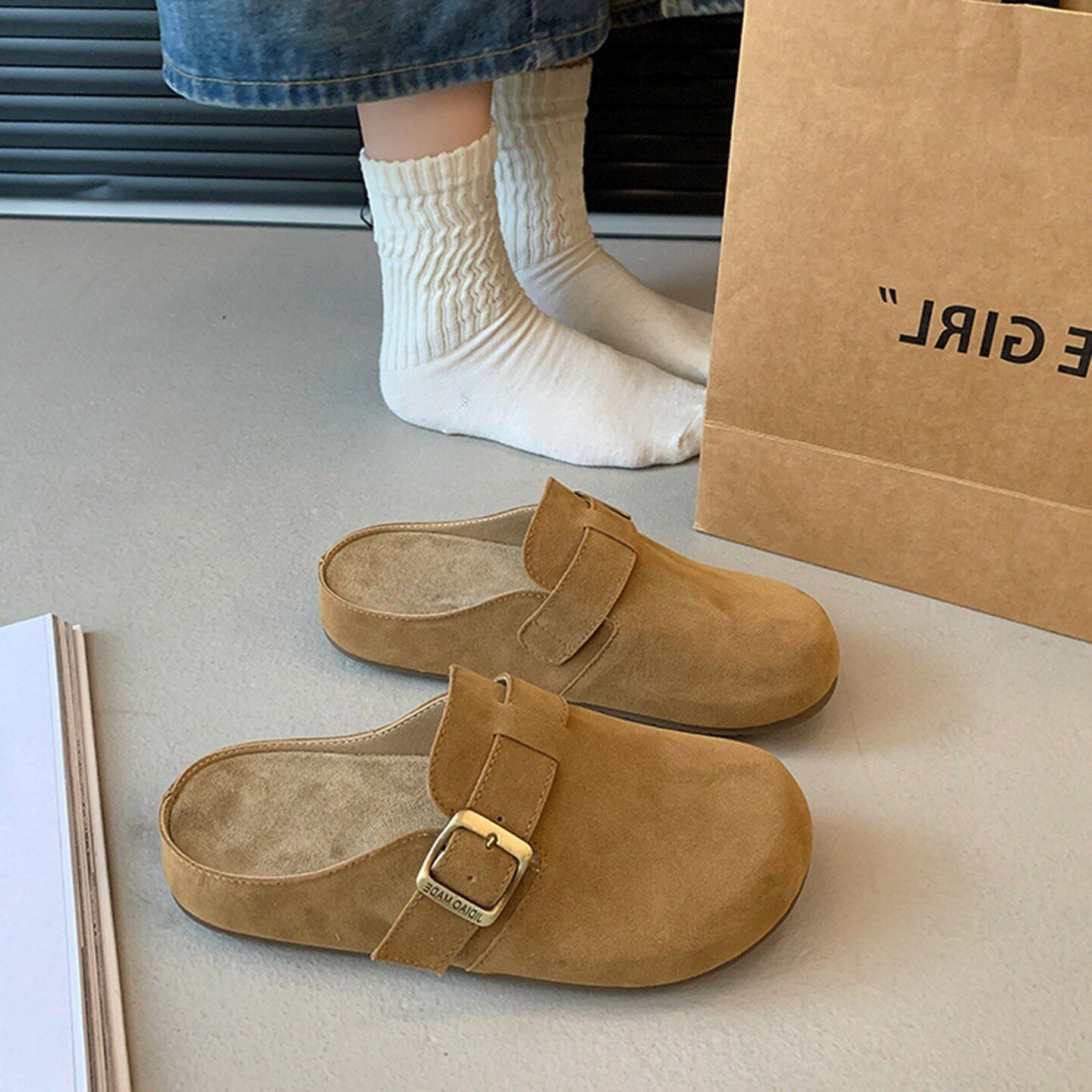 叁叔家~内增高勃肯鞋女加绒秋冬保暖毛毛半拖外穿厚底博肯鞋