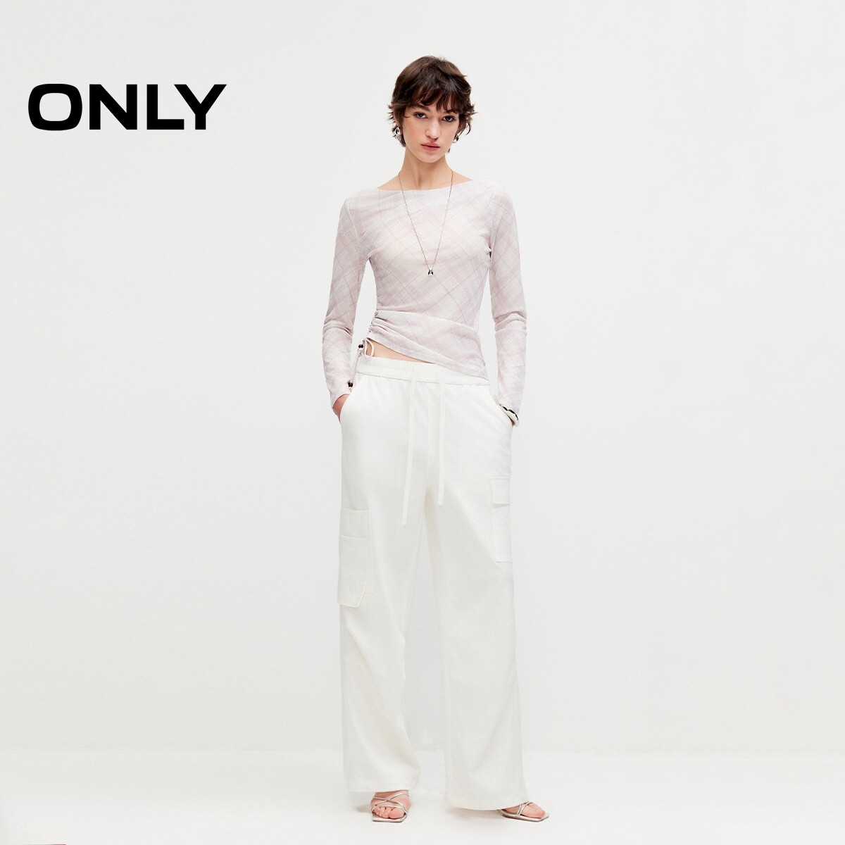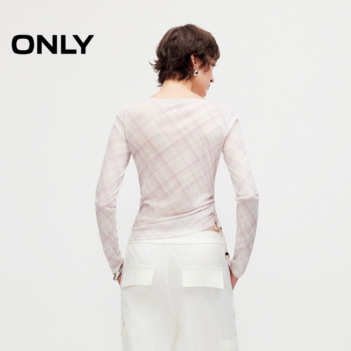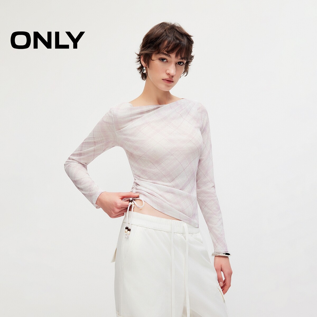 ONLY2026春季新款上衣腰侧抽绳轻薄弹力不规则一字领修身T恤女