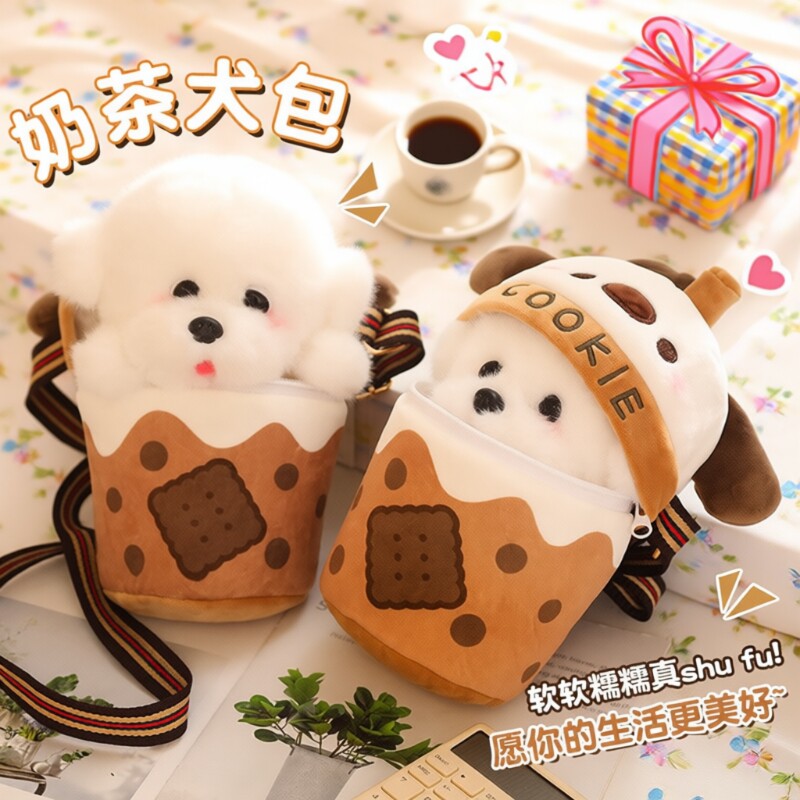 圣诞节奶茶杯可爱犬狗公仔斜挎单肩包毛绒玩具玩偶礼物女孩闺蜜