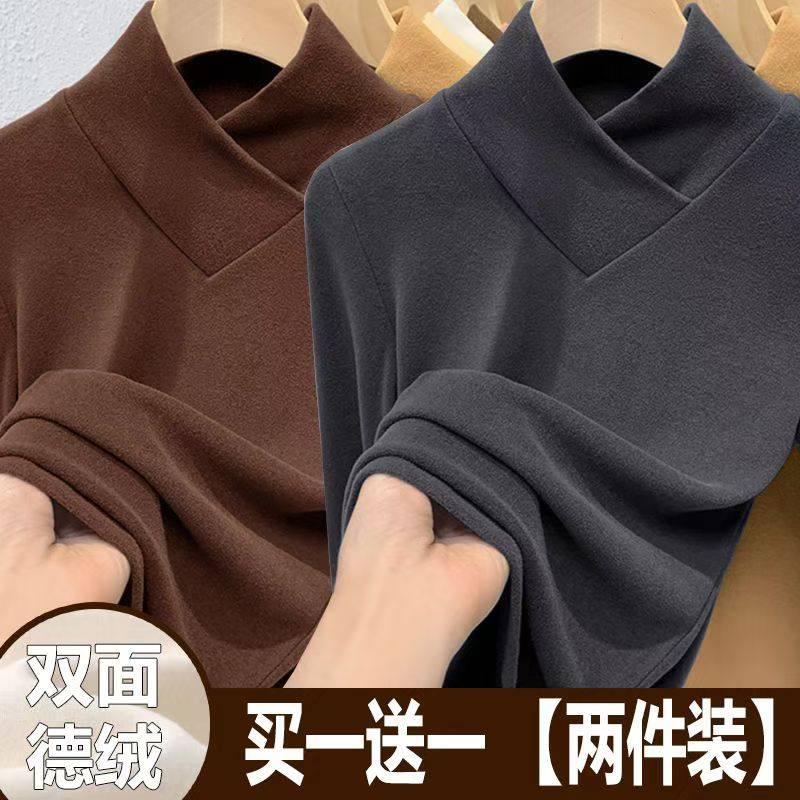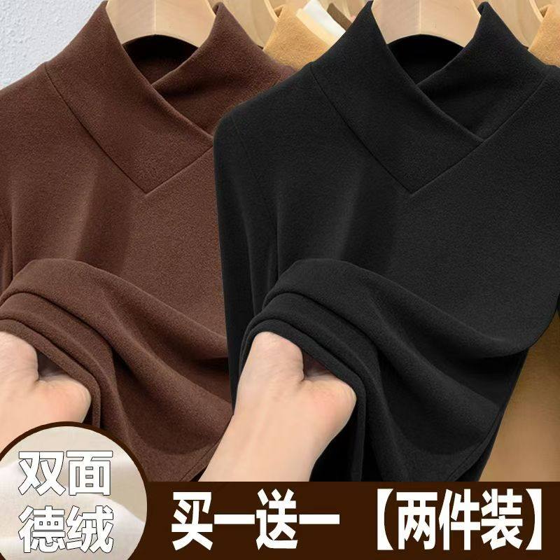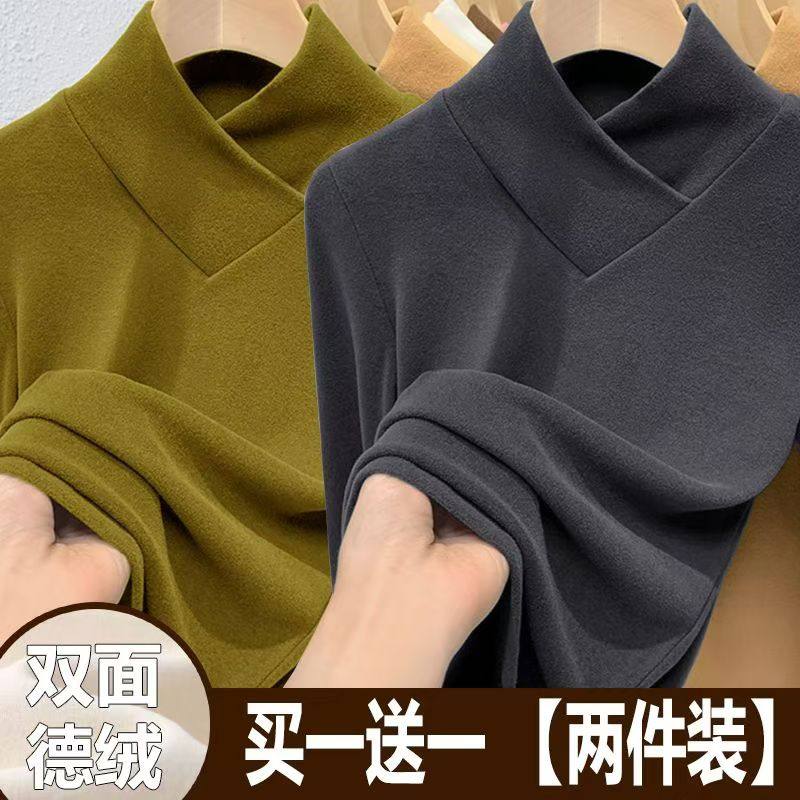 单/两件 德绒长袖v领打底衫女秋冬款百搭交叉领洋气t恤外穿上衣B