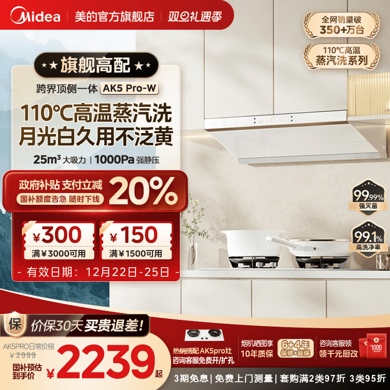 美的官方蒸汽洗AK5Pro油烟机白色家用厨房大吸力顶侧一体免拆洗