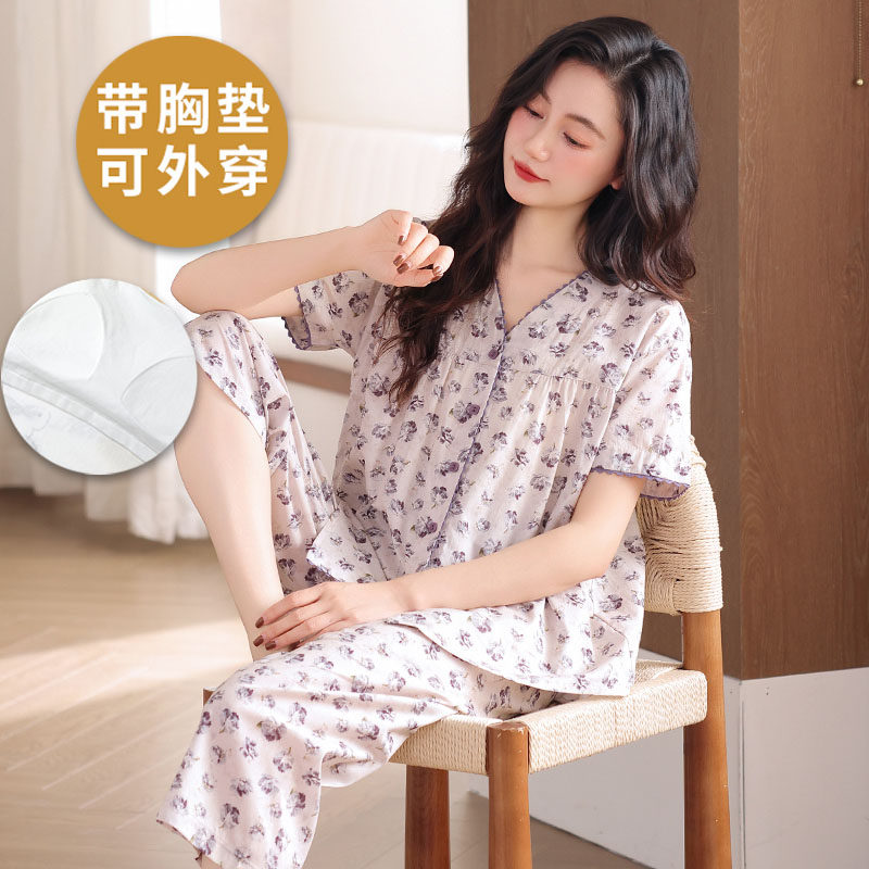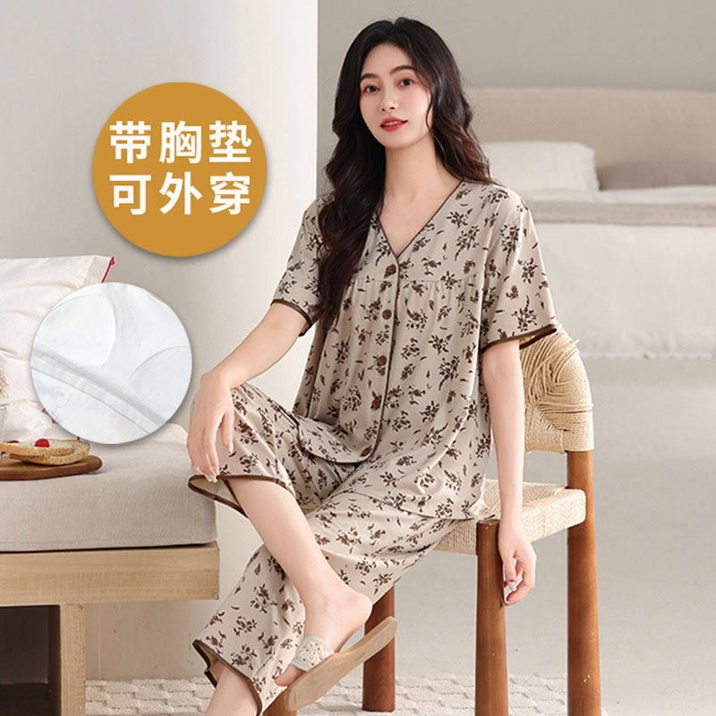 浪莎带胸垫睡衣女春夏季薄款纯棉短袖七分裤可外穿韩范家居服套装