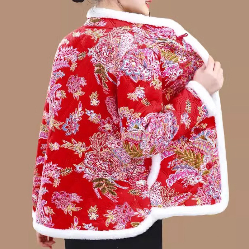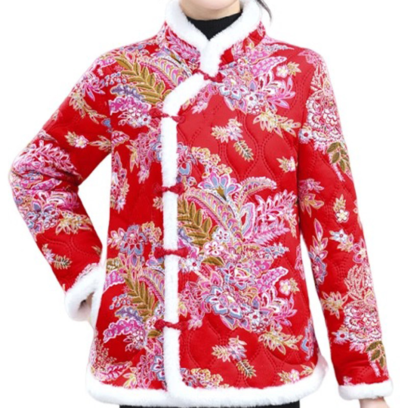 新款冬装妈妈时尚碎花小棉衣短款外套加厚大花棉袄女装中国风红色