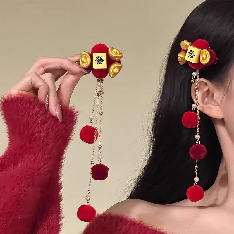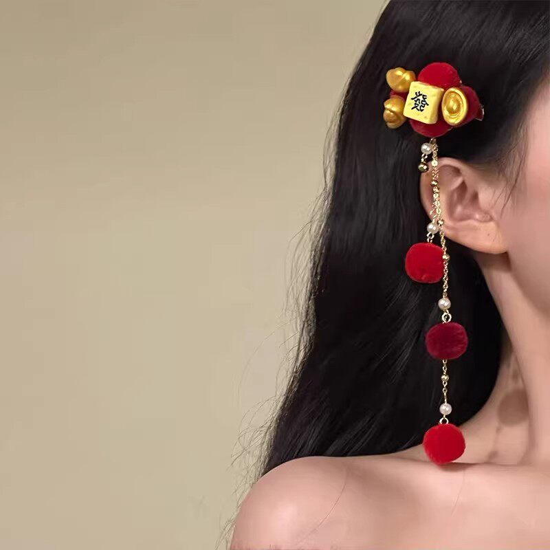 红色毛球流苏发夹2026新款古风汉服配饰金色元宝头饰短发黑色羽毛