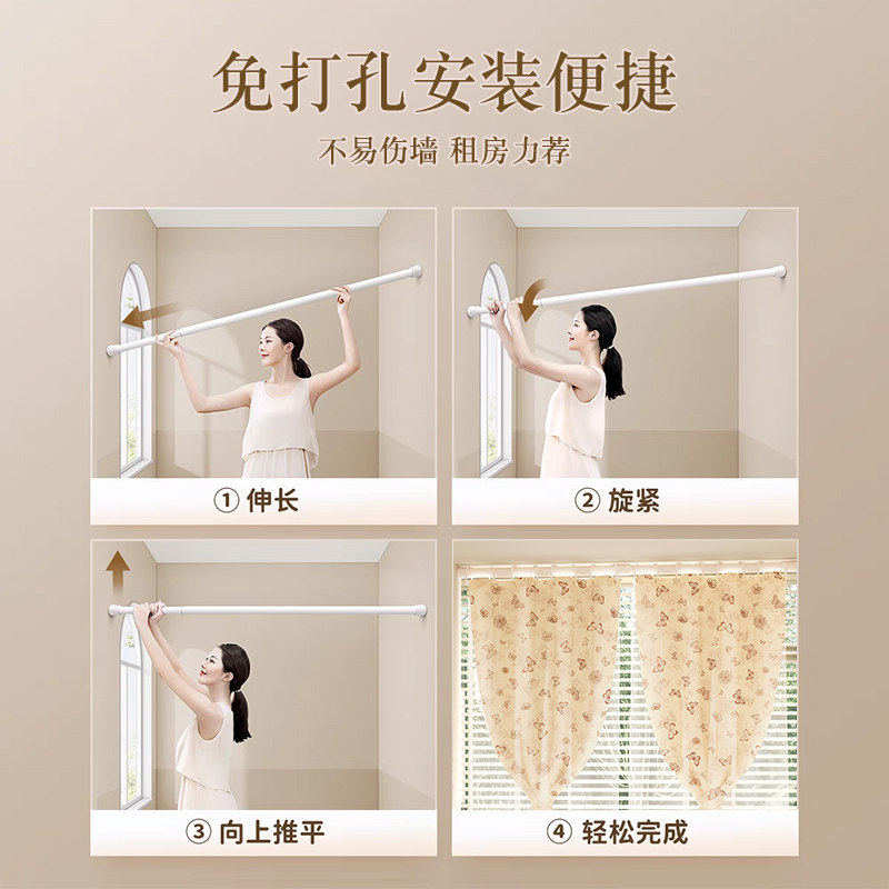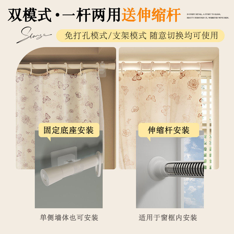 窗帘法式免打孔安装飘窗帘遮阳帘窗户遮挡帘伸缩杆门帘布纱一体新