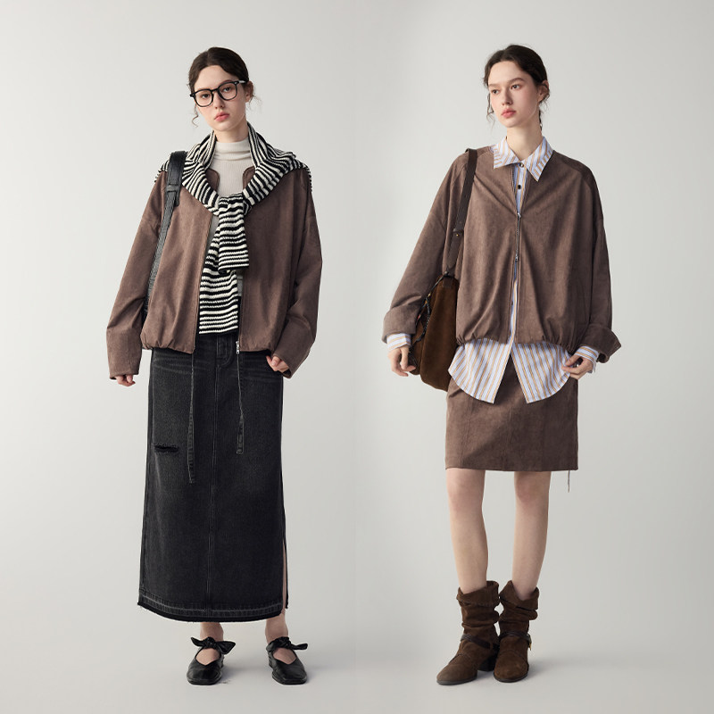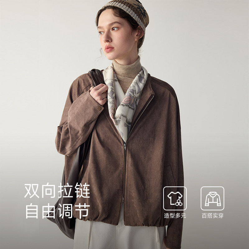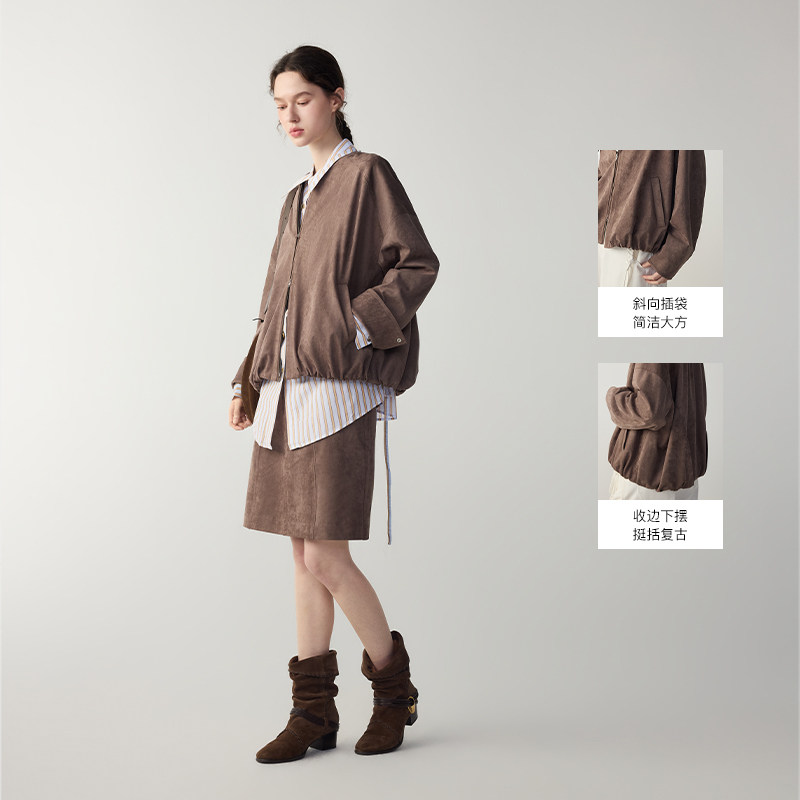 MSLAN中古秋日 26春法式复古仿麂皮外套圆领美拉德棕色短款夹克