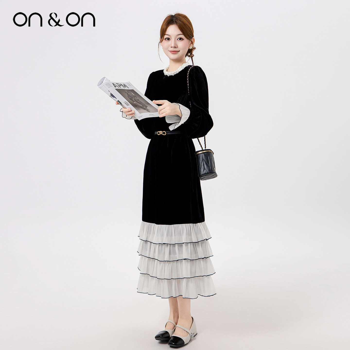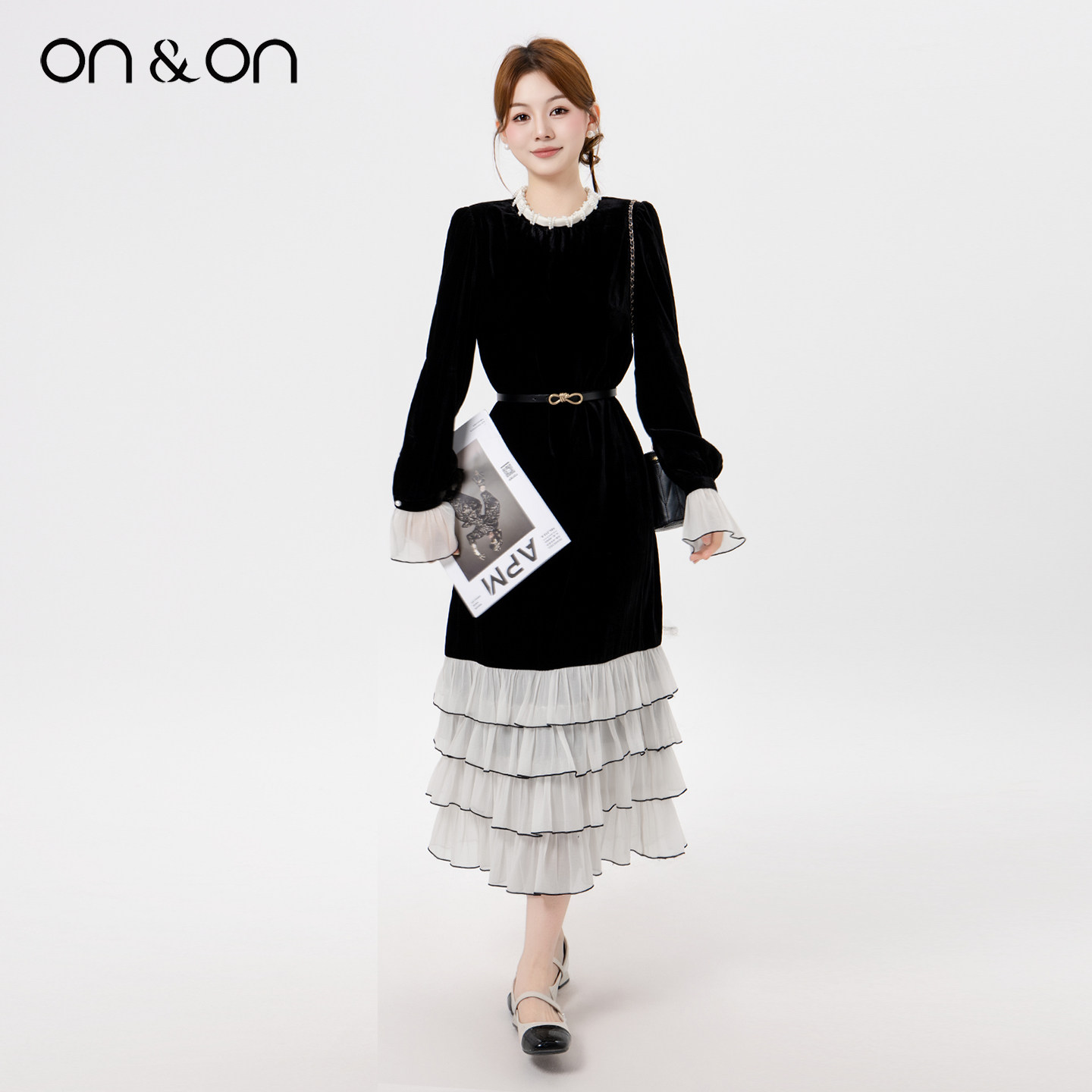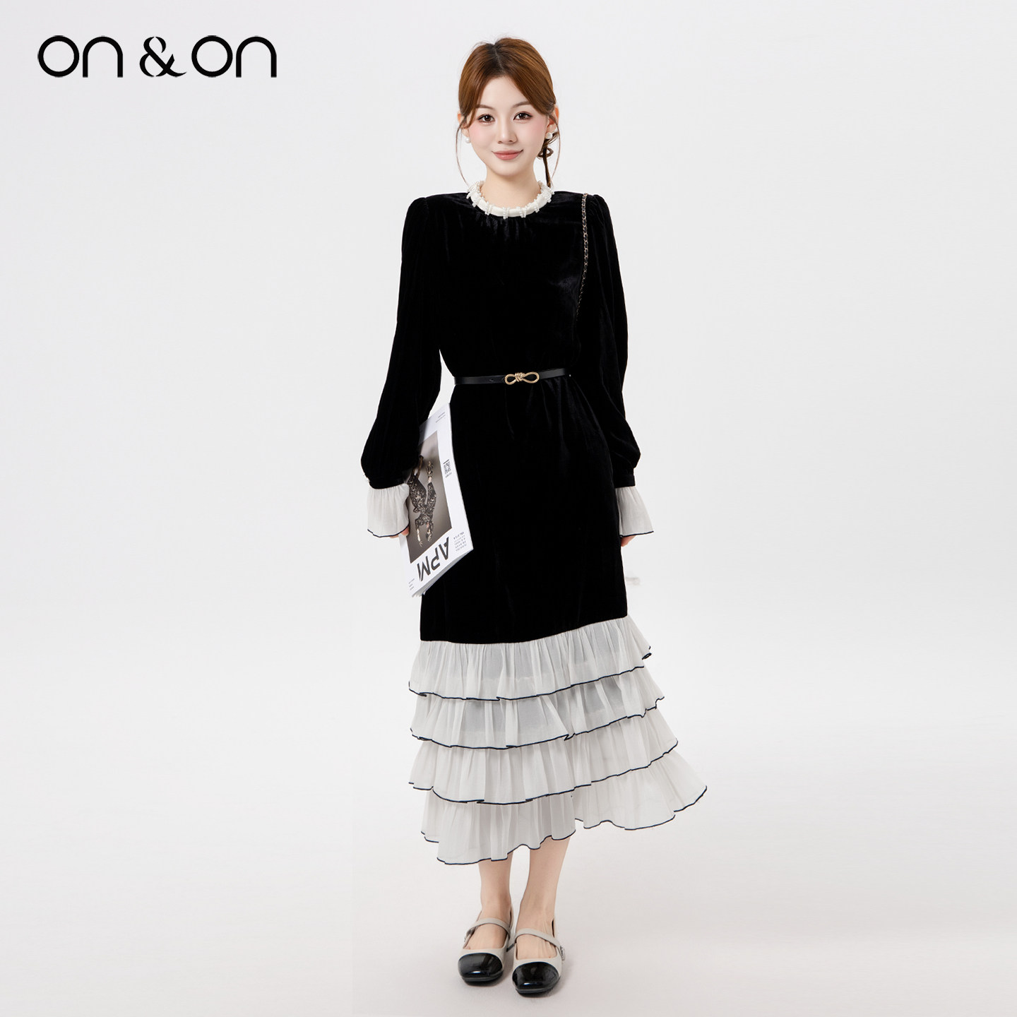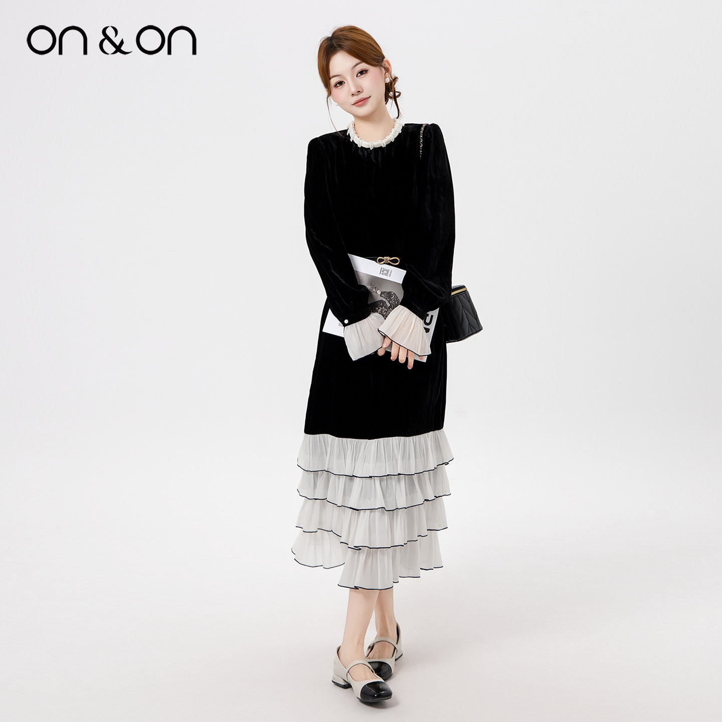 ON&ON/安乃安2025冬季新款法式蕾丝拼接蛋糕裙摆丝绒赫本连衣裙