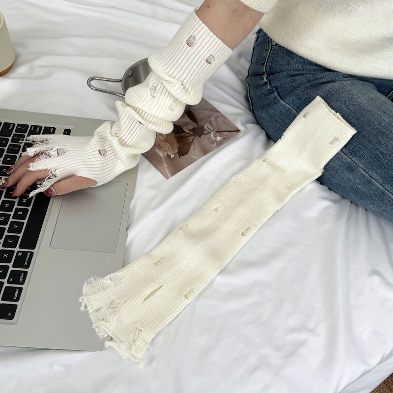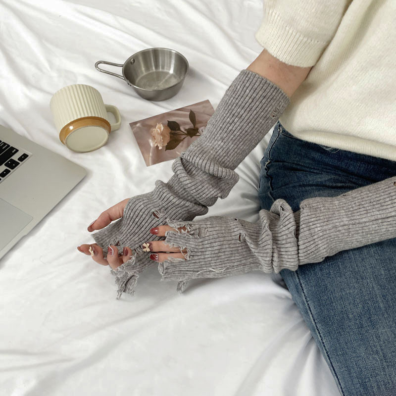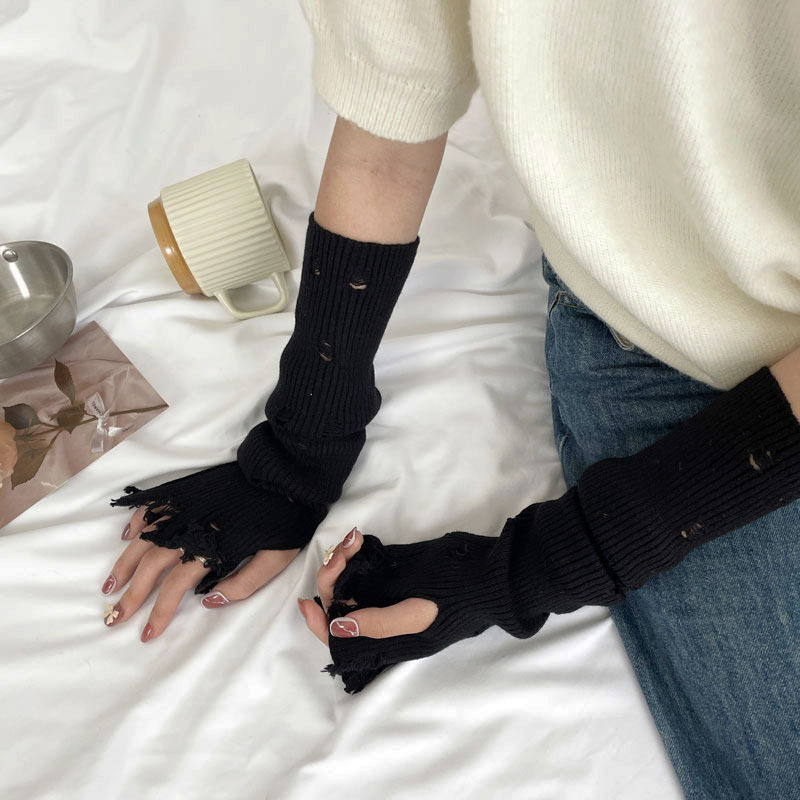 (破洞设计)韩版分指手套外出骑行防晒防寒针织破洞袖套简约个性