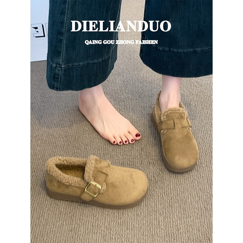 TATAFOCUS~加绒毛毛鞋韩版圆头皮带扣2025冬季新款勃肯鞋女35-28