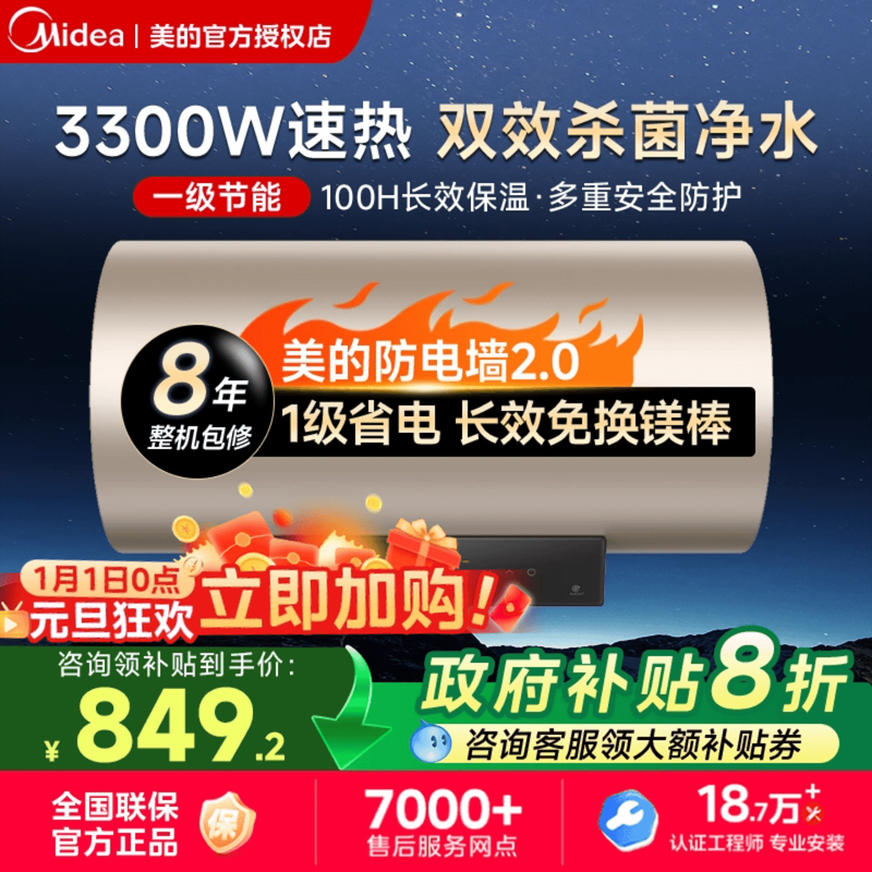 美的变频电热水器免换镁棒一级能效60L80升洗澡家用速热储水式J7P