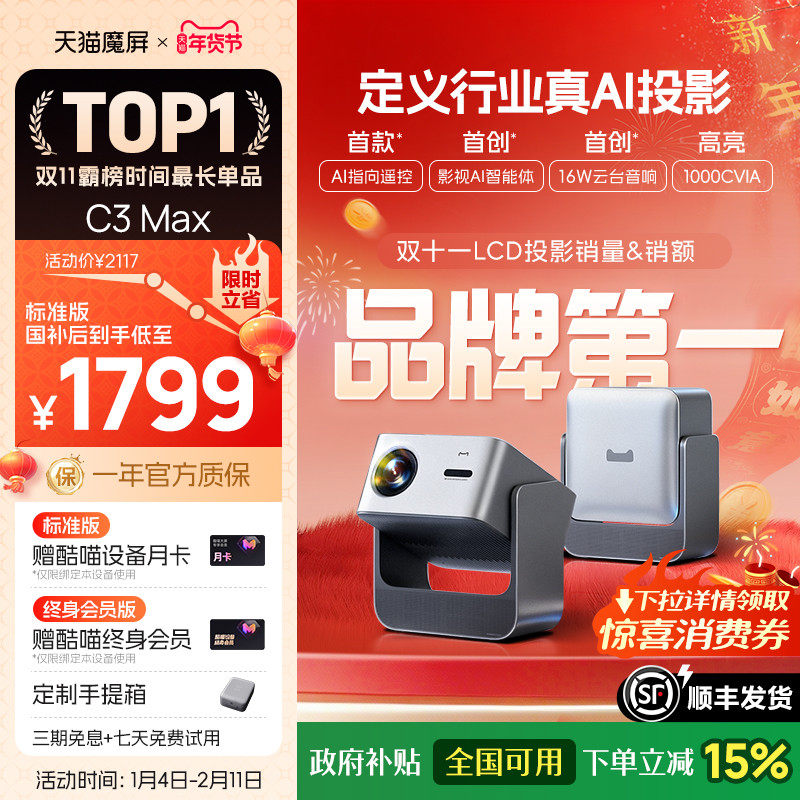 【政府补贴全国可用 淘金币下单再减】天猫魔屏C3 Max投影仪智能影院便携家用超高清M2投影机真1080P投墙