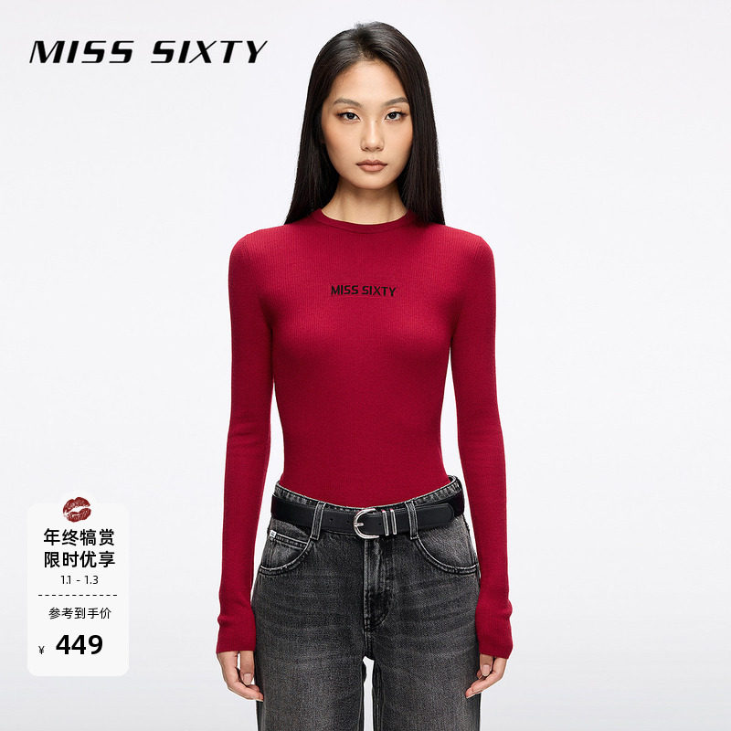 【新年穿搭】Miss Sixty25秋新款针织衫女羊毛桑蚕丝混纺红色毛衣