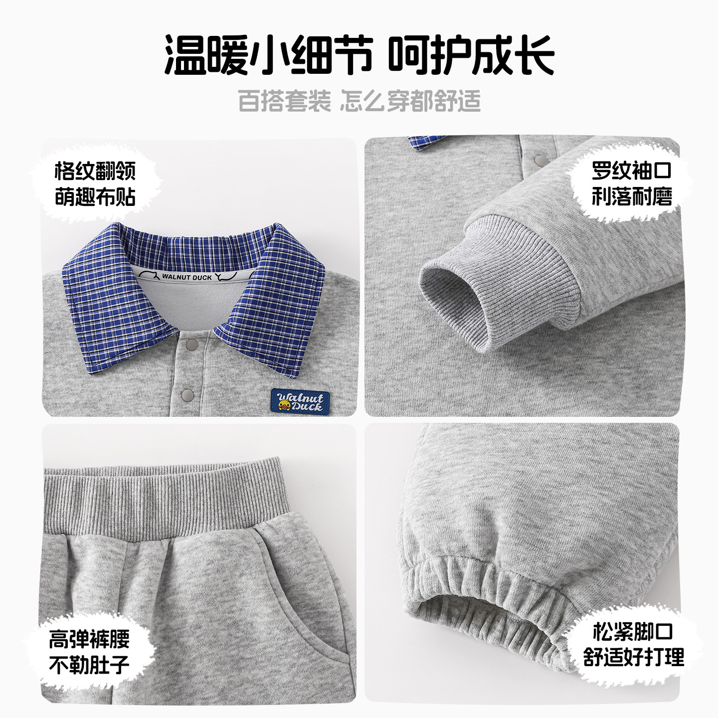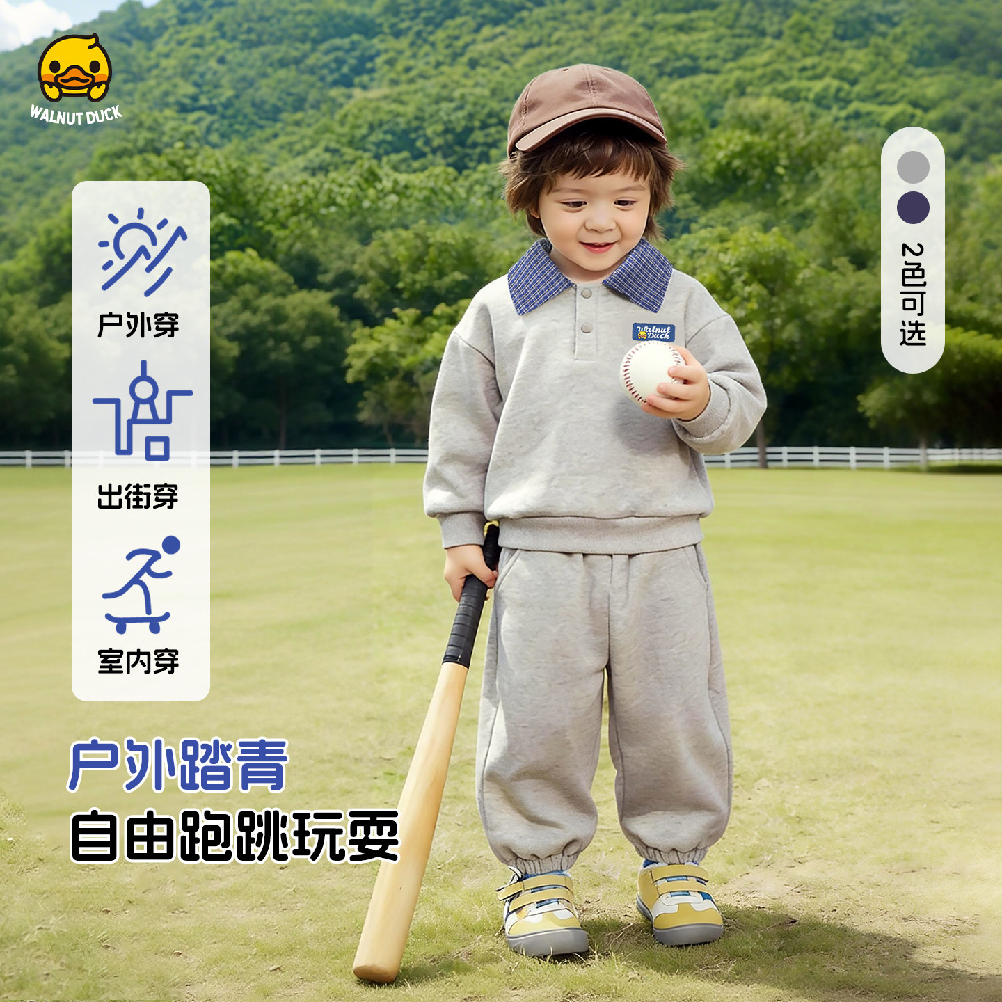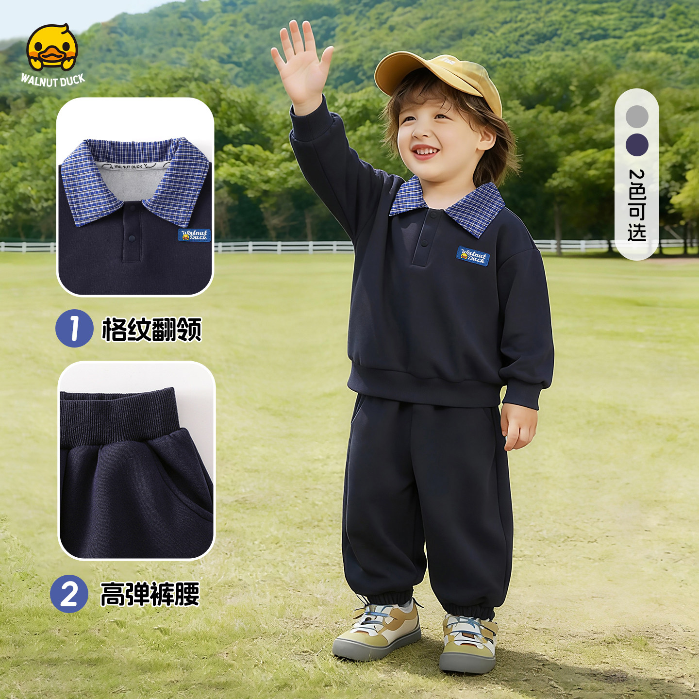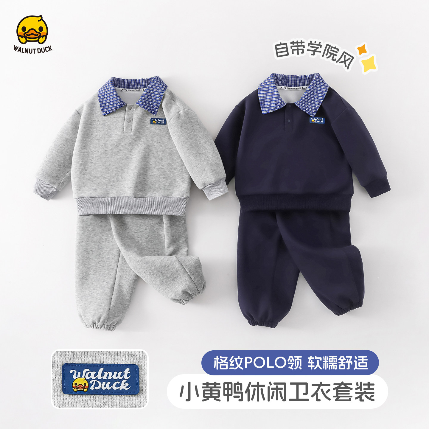 核桃小黄鸭儿童POLO领格纹卫衣套装春秋宝宝休闲运动两件套学院风