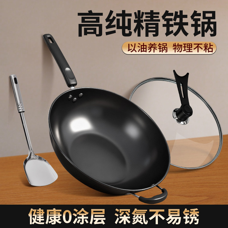 老式铁锅家用不粘锅炒锅燃气灶电磁炉专用炒菜锅无涂层大平底圆底