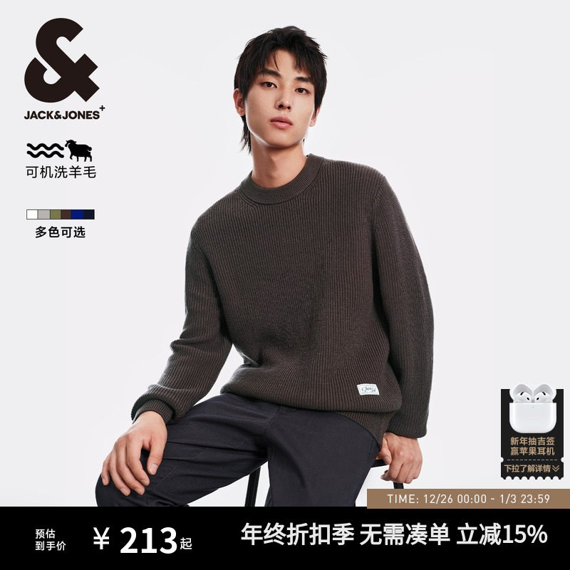 【可机洗】杰克琼斯男装秋冬新款纯色贴布打底衫圆领毛衣针织衫