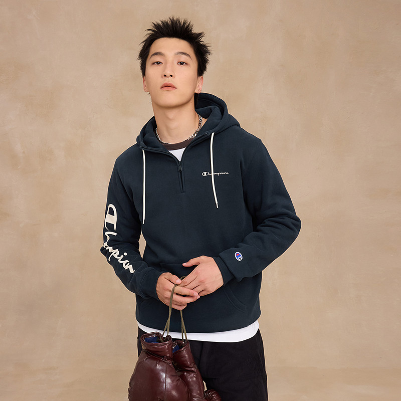Champion冠军加绒连帽卫衣男2025冬季新款美式风半拉链上衣秋季