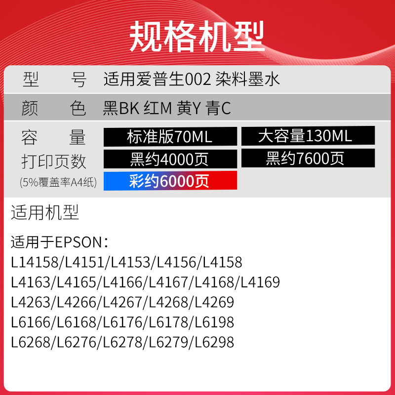天威适用爱普生002墨水L4158 L4168 L4156 L6178 L4263 L4166 L4266 L4169 L6279 L4269 L4268打印机非原装