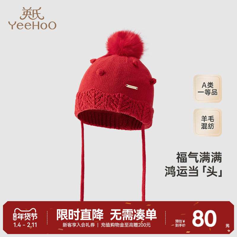 英氏婴儿帽子冬季羊毛保暖男童女童喜庆新年红色圣诞圆顶毛织帽