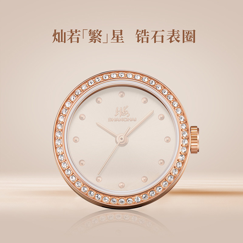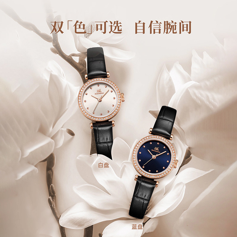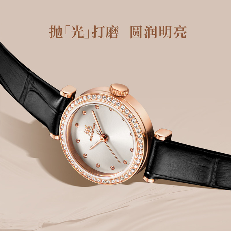 上海手表女款摩登系列小玉兰复古玲珑锆石壳黑带石英表