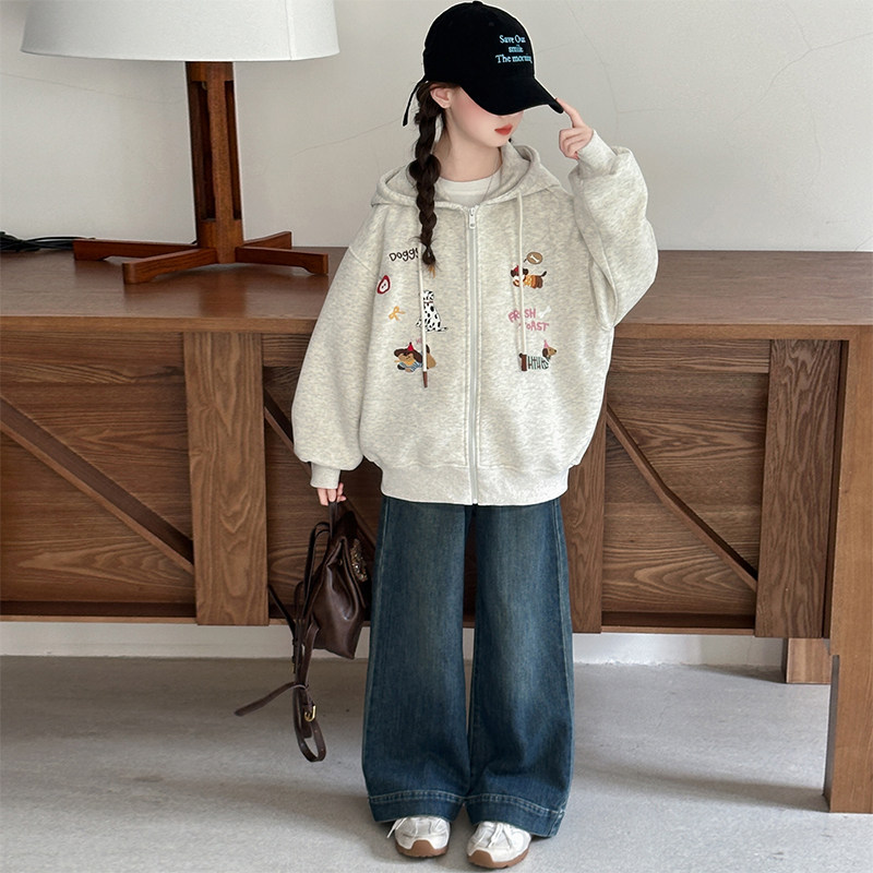女童夹棉加厚卫衣外套秋冬款2025新款儿童冬装女孩上衣轻薄灰色