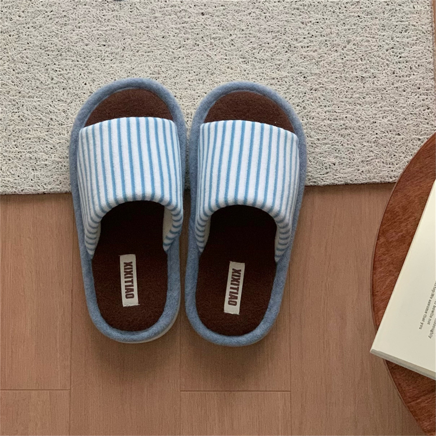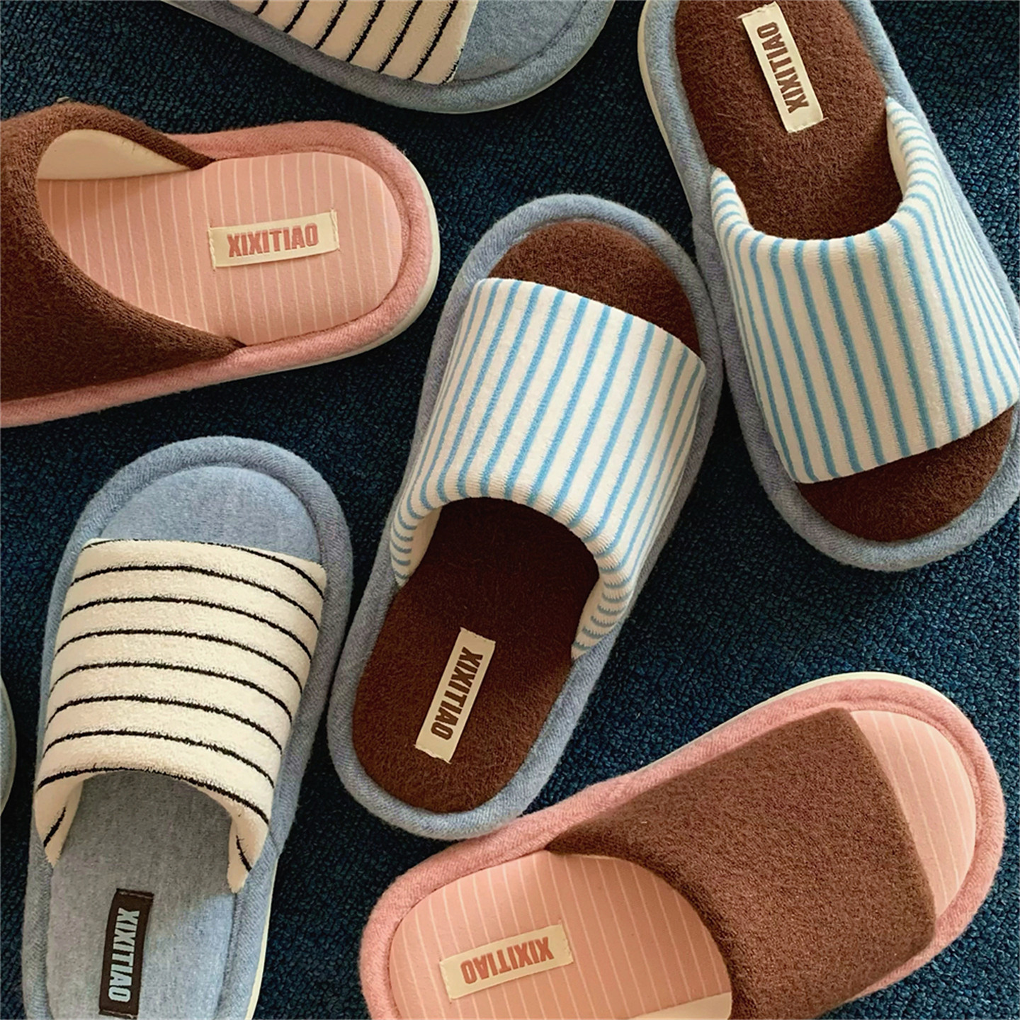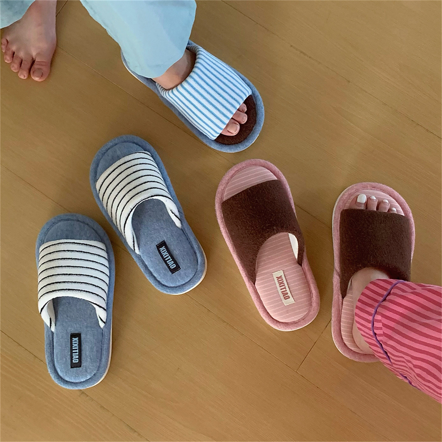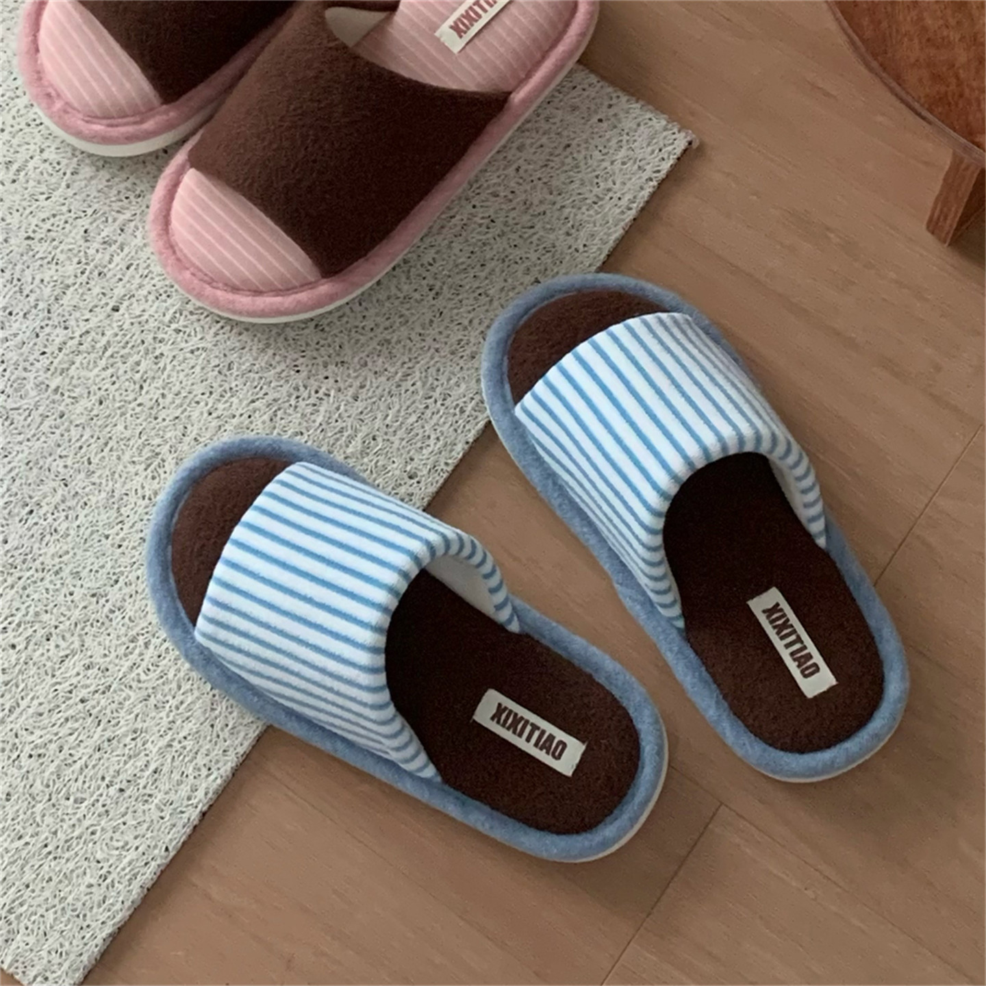 细细条 一字秋冬情侣简约棉麻地板鞋防滑复古撞色条纹男女棉拖鞋