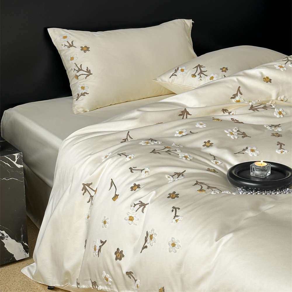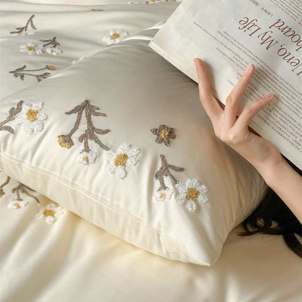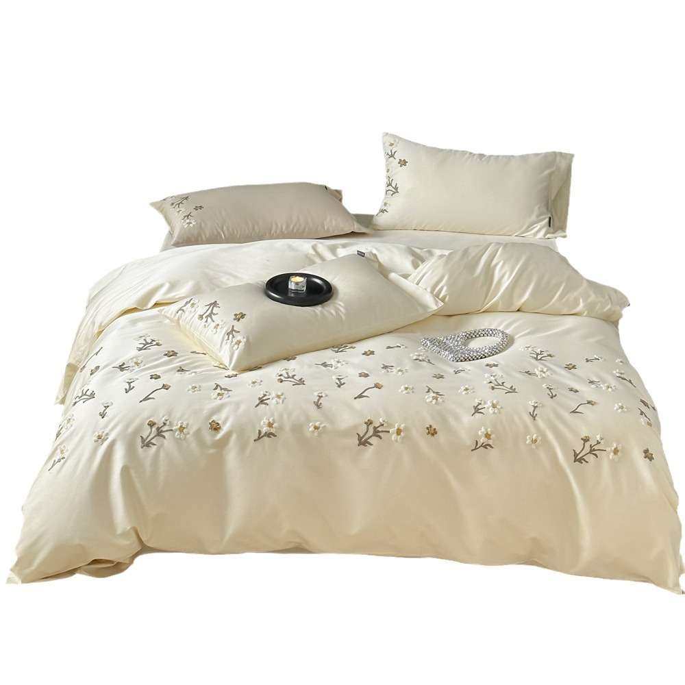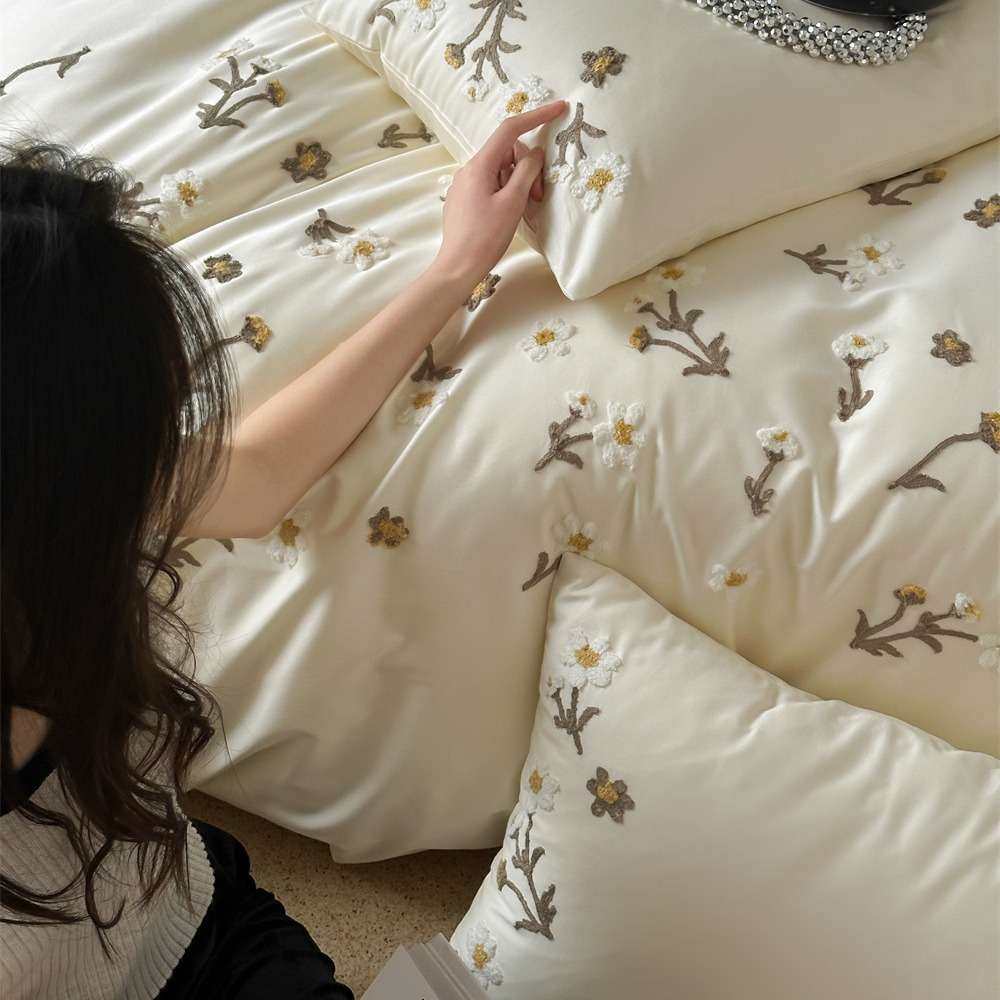 小清新贡缎长绒棉四件套轻奢田园风小花毛巾绣纯棉被套床单