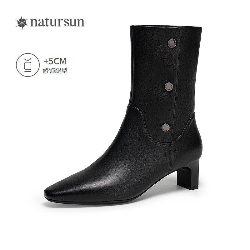 natursun复古时装靴春季休闲百搭女士高跟瘦瘦靴尖头气质中跟靴
