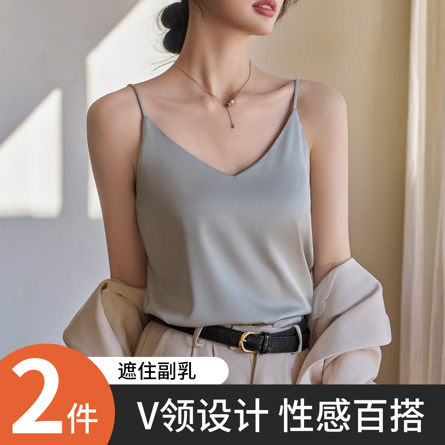 V领缎面真丝吊带背心女春夏季西装内搭细肩带遮副乳无袖打底上衣