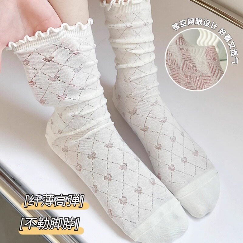 袜子配小皮鞋儿童夏季薄款白色花边袜中筒袜网眼夏天女大童堆堆袜