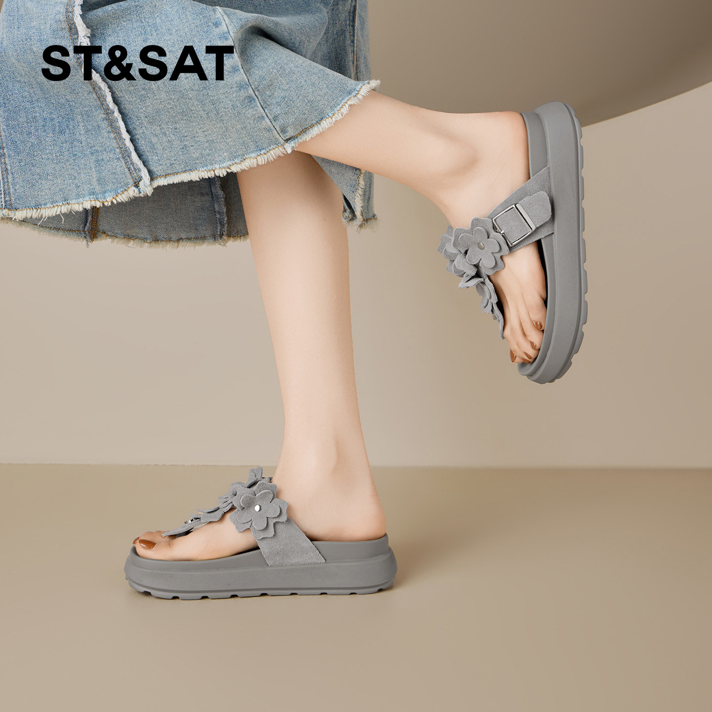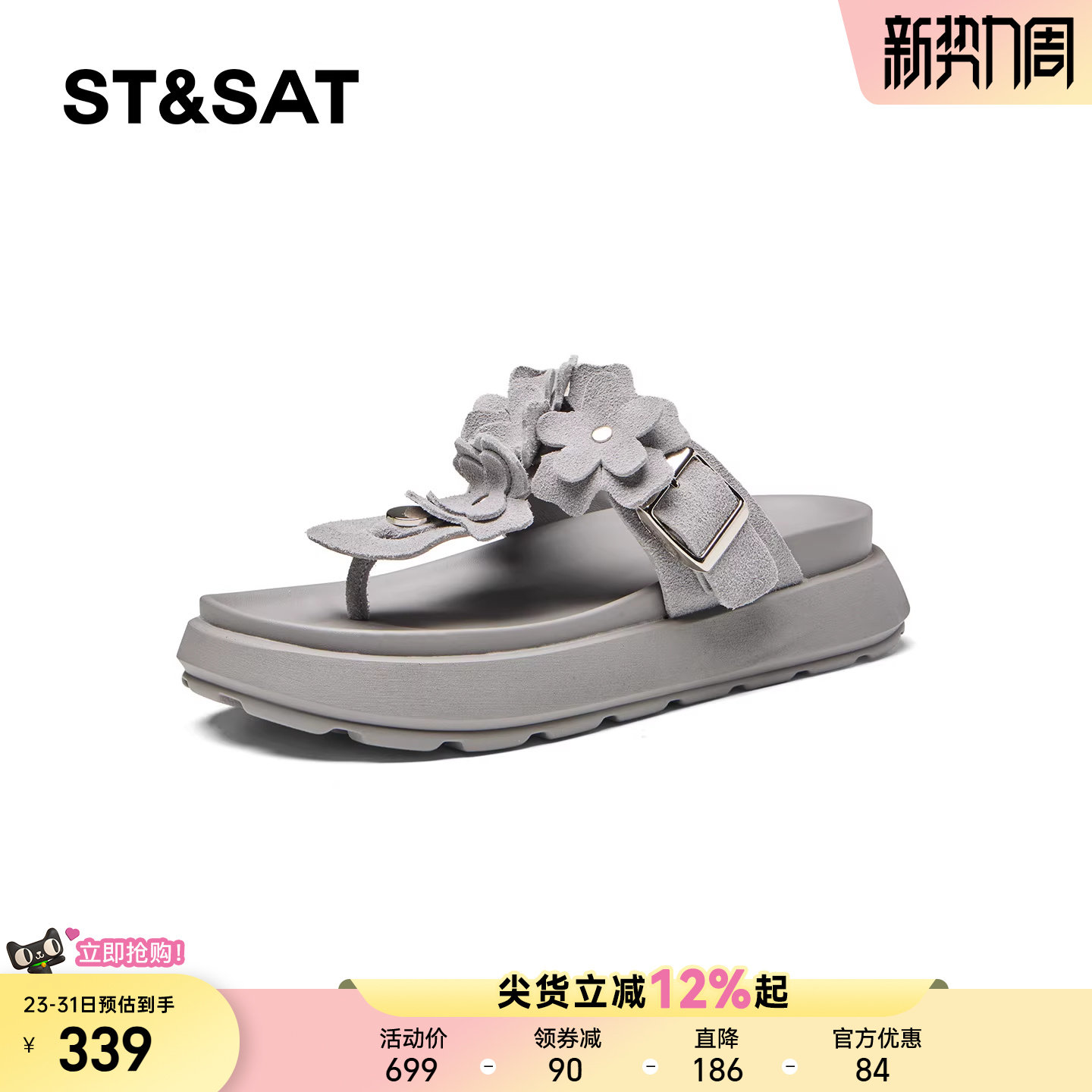 星期六厚底人字拖女2026夏季新款花朵装饰懒人外穿防滑沙滩凉拖鞋
