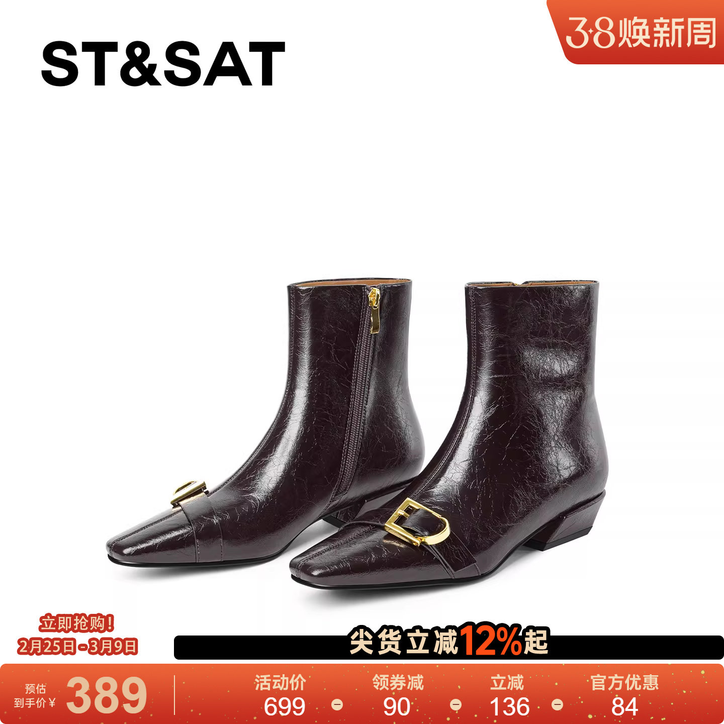 星期六酒红色短靴女2025秋冬方头粗跟显瘦裸靴气质低跟复古时装靴