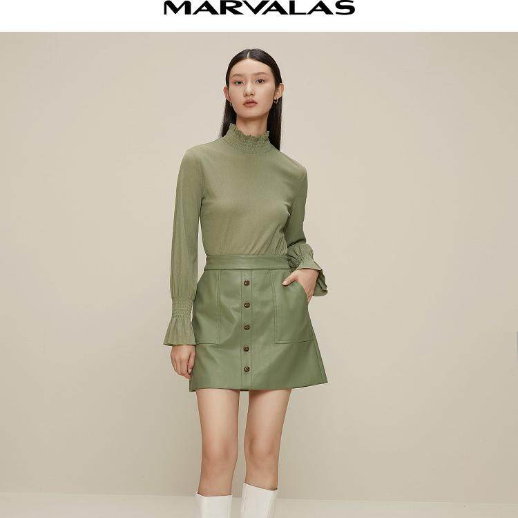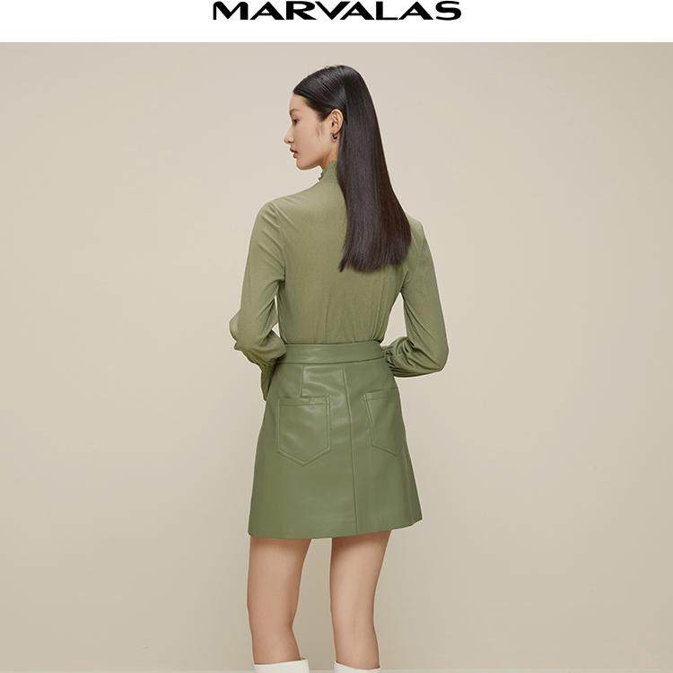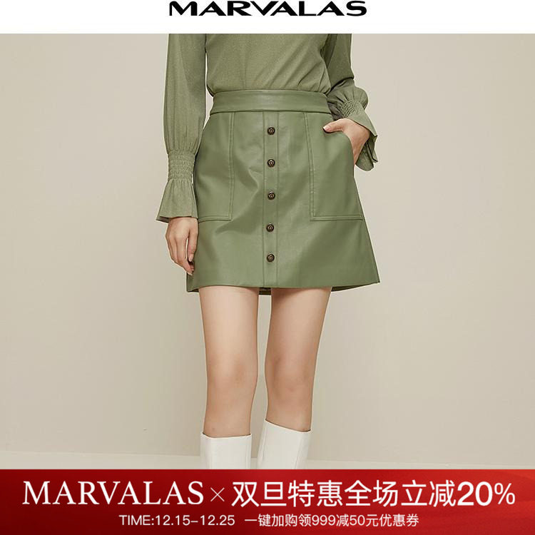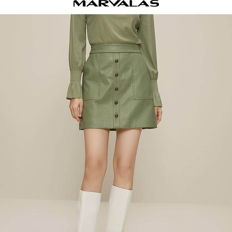 曼德诗绿色短款皮裙女2025春秋新款百搭气质裙子简约高腰显瘦短裙