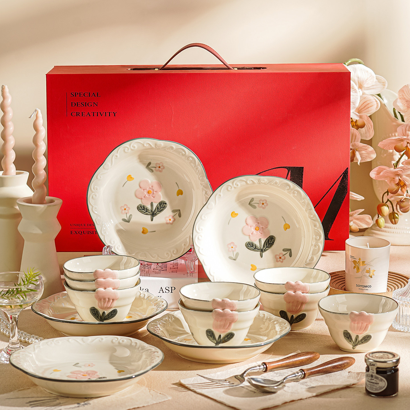 高档碗碟餐具陶瓷新婚礼物送新娘红色碗盘筷套装乔迁新居结婚礼盒