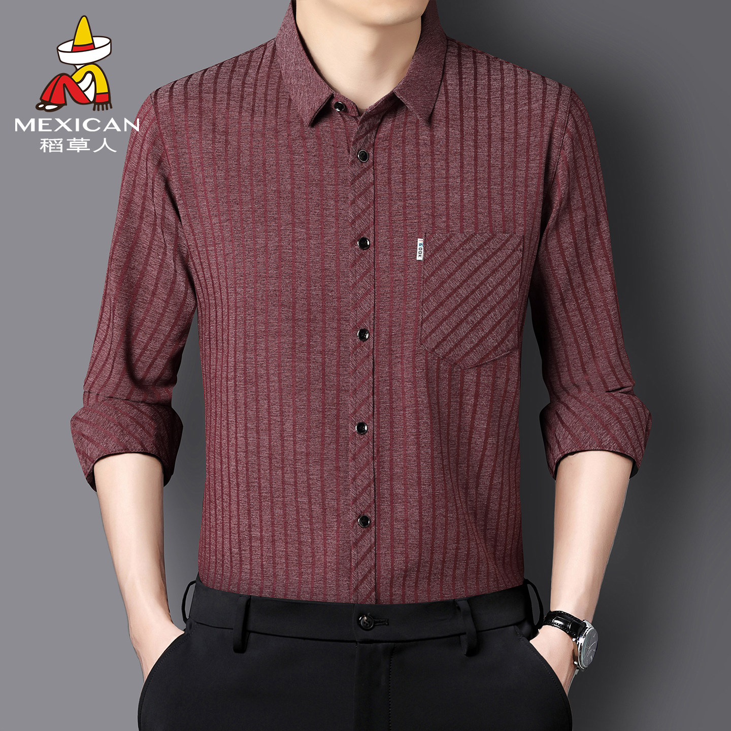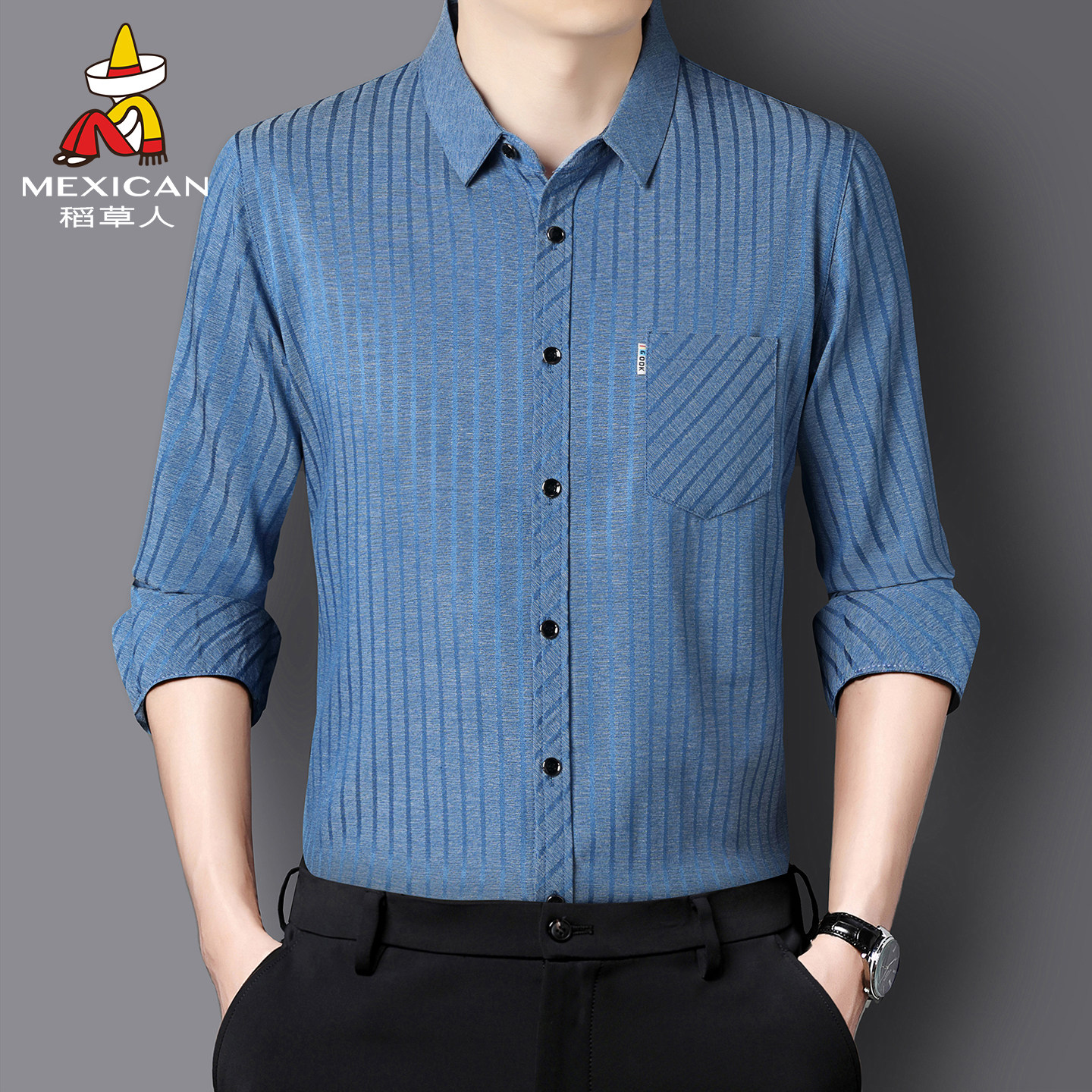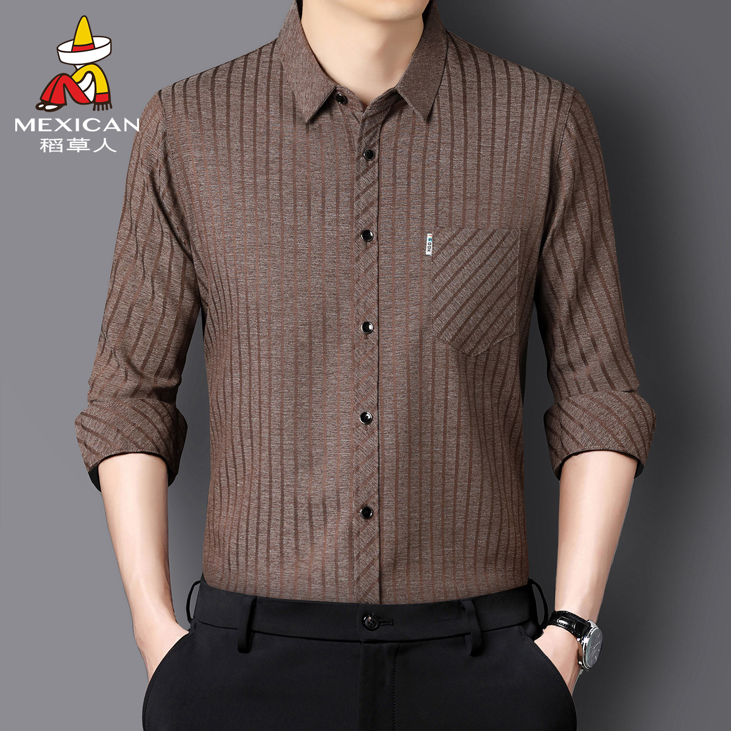 稻草人桑蚕丝长袖衬衫男春秋款抗皱免烫商务衬衣男士亚麻爸爸装J