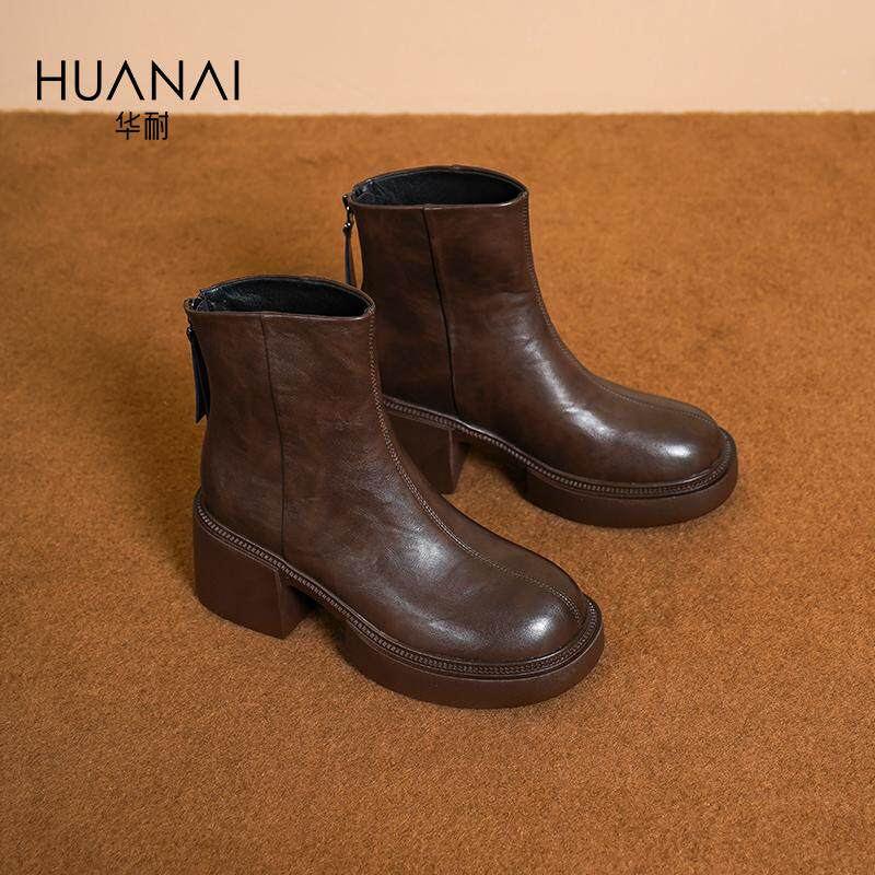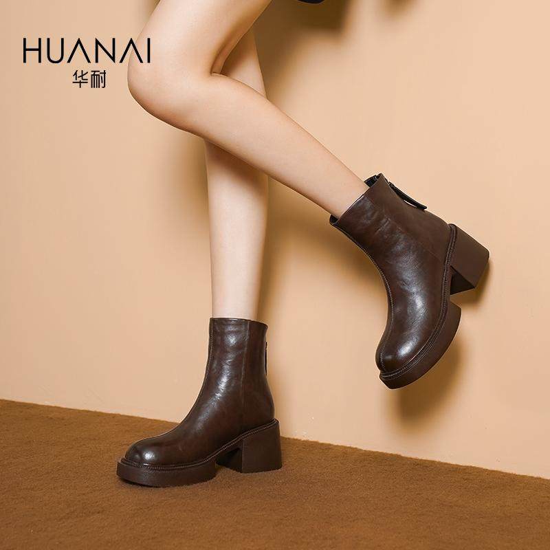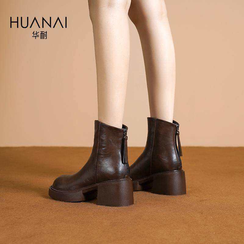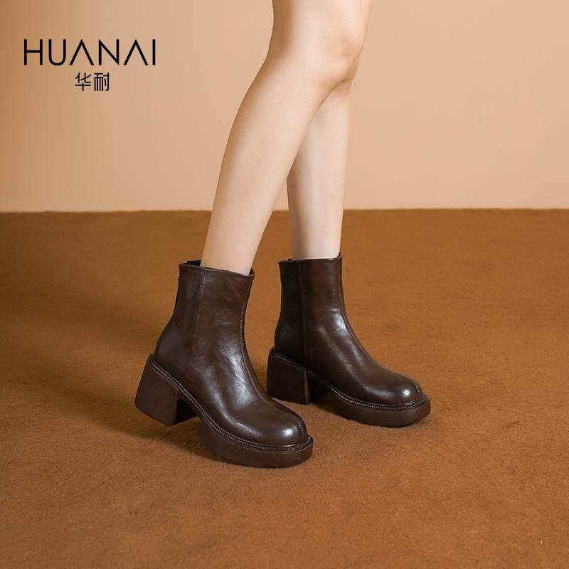 华耐短筒皮靴厚底靴气质粗跟2025冬新款通勤百搭英伦风松糕底短靴