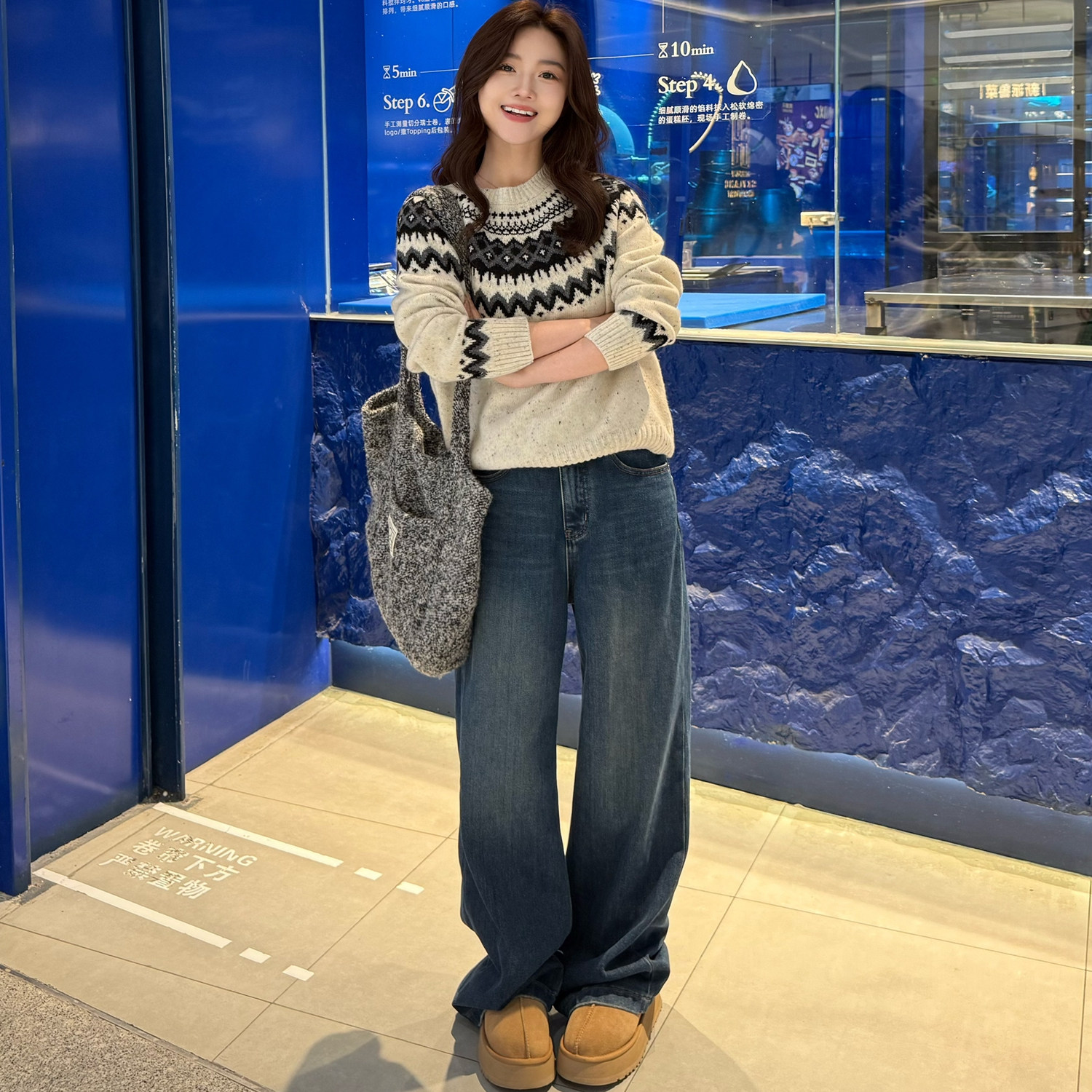曹大曼 法式费尔岛全羊毛提花圆领毛衣女复古几何开衫圣诞毛衣女