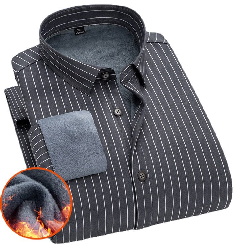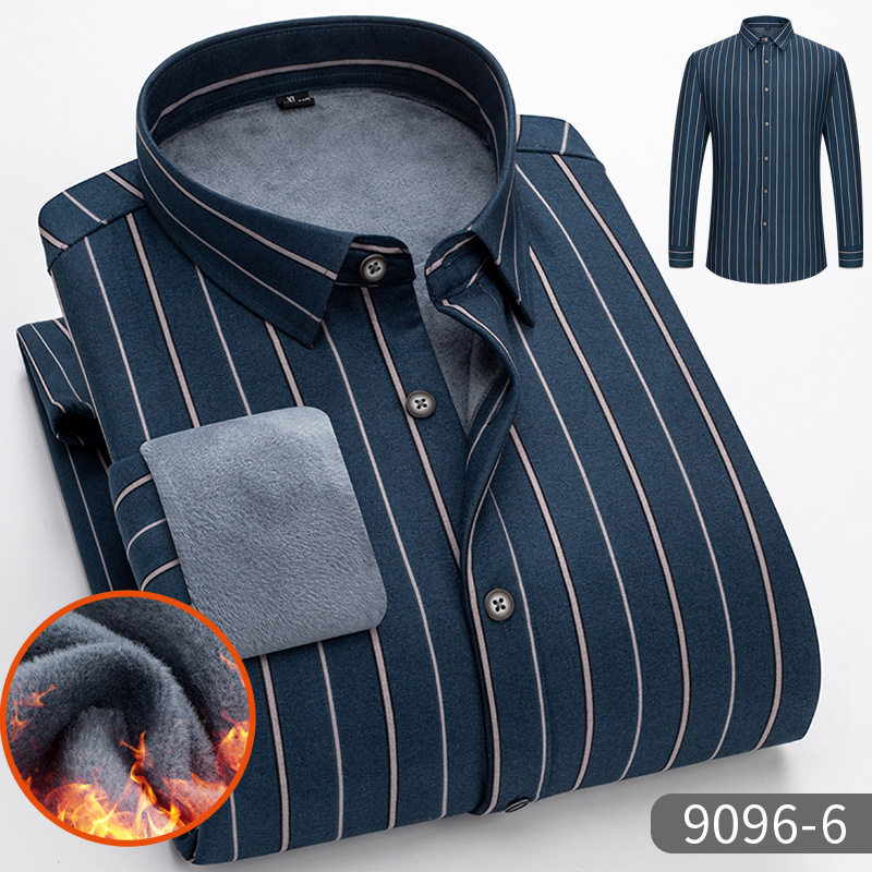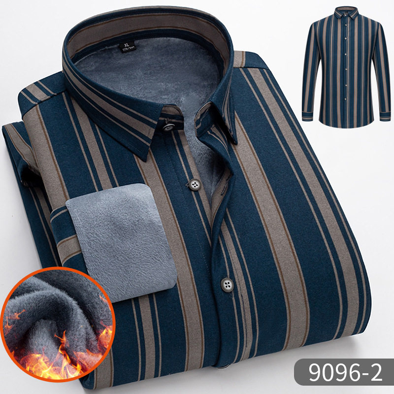 秋冬季保暖衬衣男长袖中年加绒加厚衬衣男士休闲爸爸装条纹衬衫