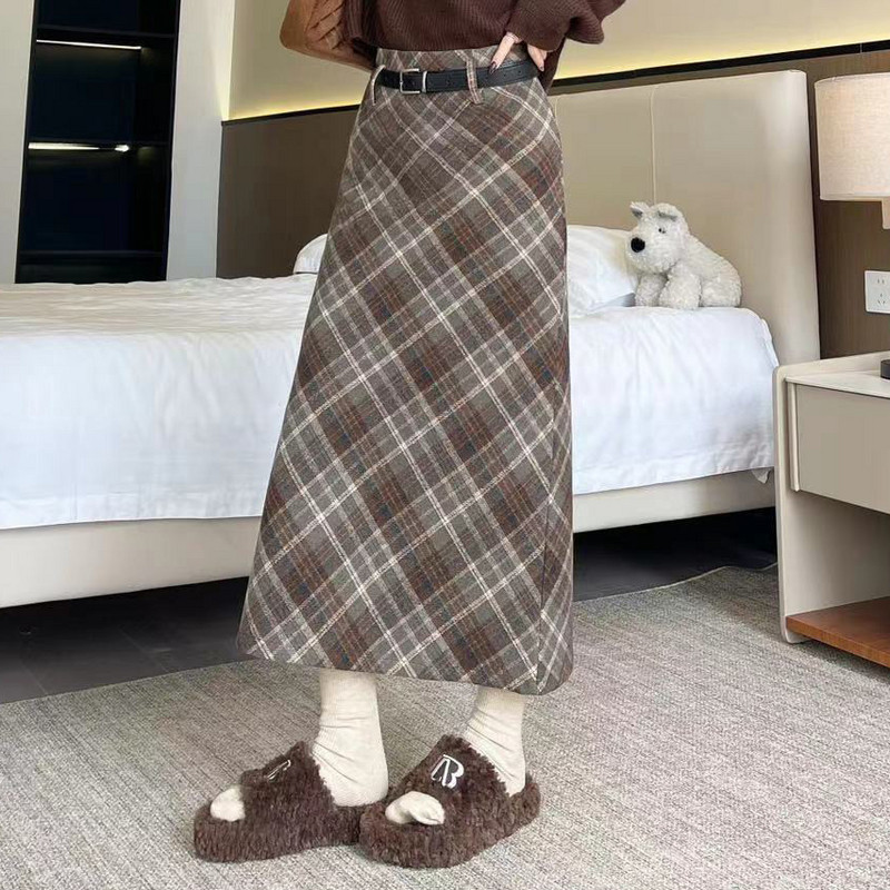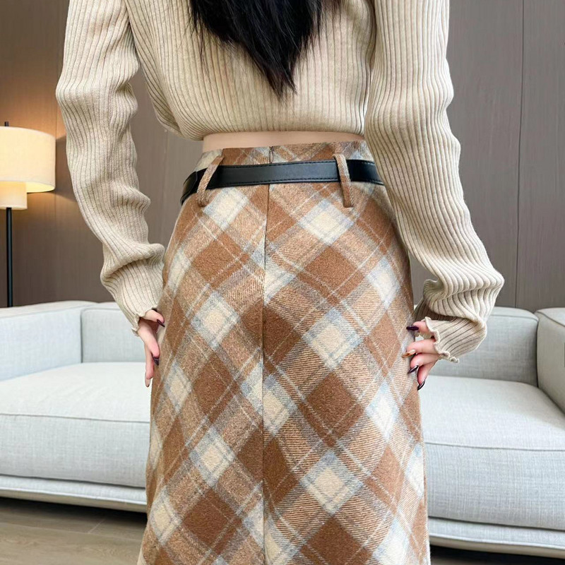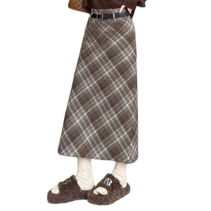 三福格子长裙女2025新款冬季气质流苏摆不规则半身裙子女装509092