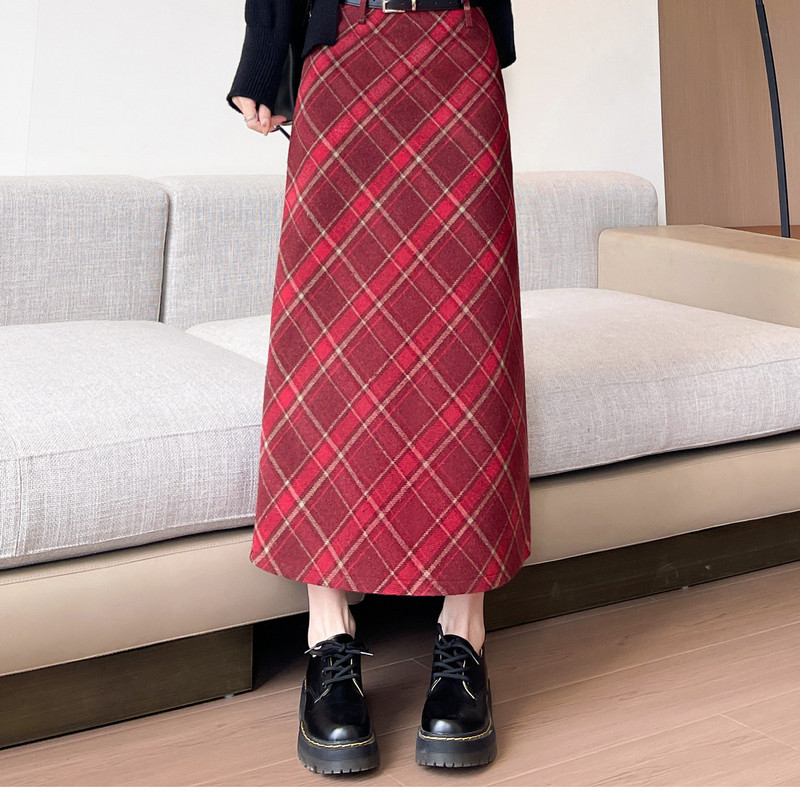 LR真维斯格子半身裙女春季新款学院风小个子格纹包臀a字毛呢长裙