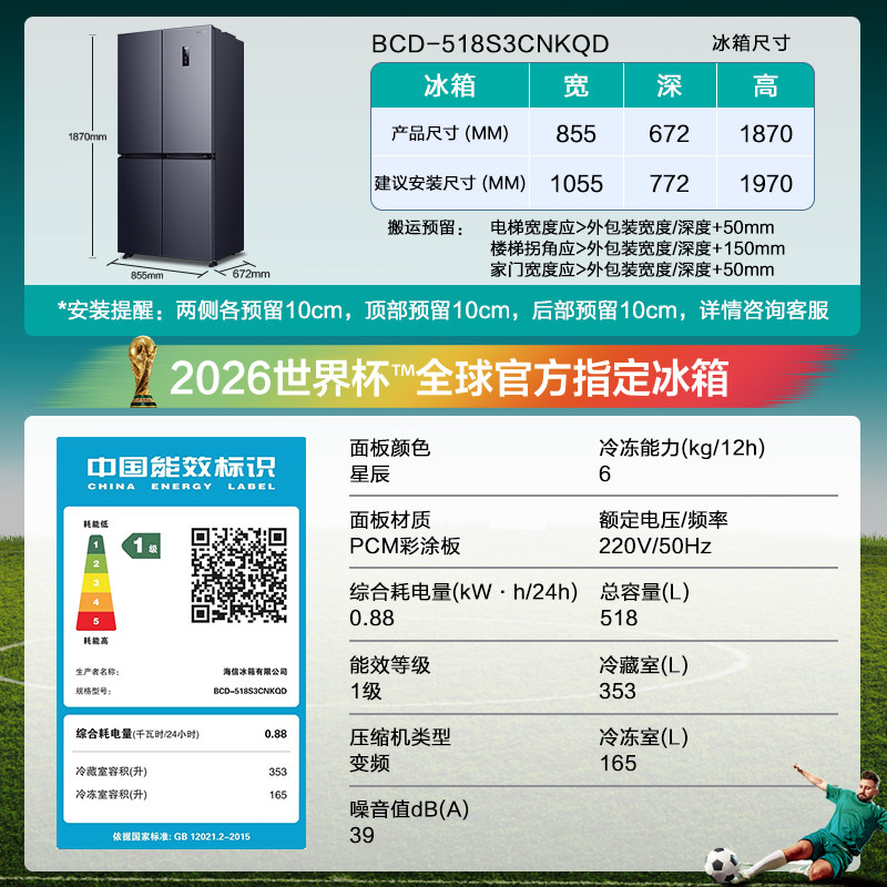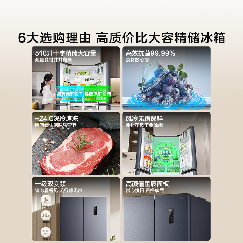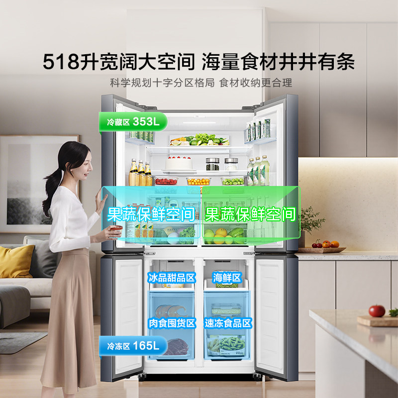 海信518L十字双开四门家用电冰箱大容量一级风冷无霜超薄以旧换新